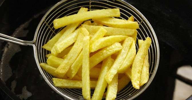 Ápdụngkỹthuậtchiên'hailầnlửa'kếthợplàmlạnhgiúp cấutrúctinhbộtthayđổi,biếnmónkhoaitâychiêntạinhà giònrụm,vàngóngvàlâuỉunhưngoàihàng. Lầnmột:Chiênlửanhỏ