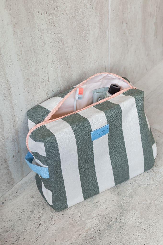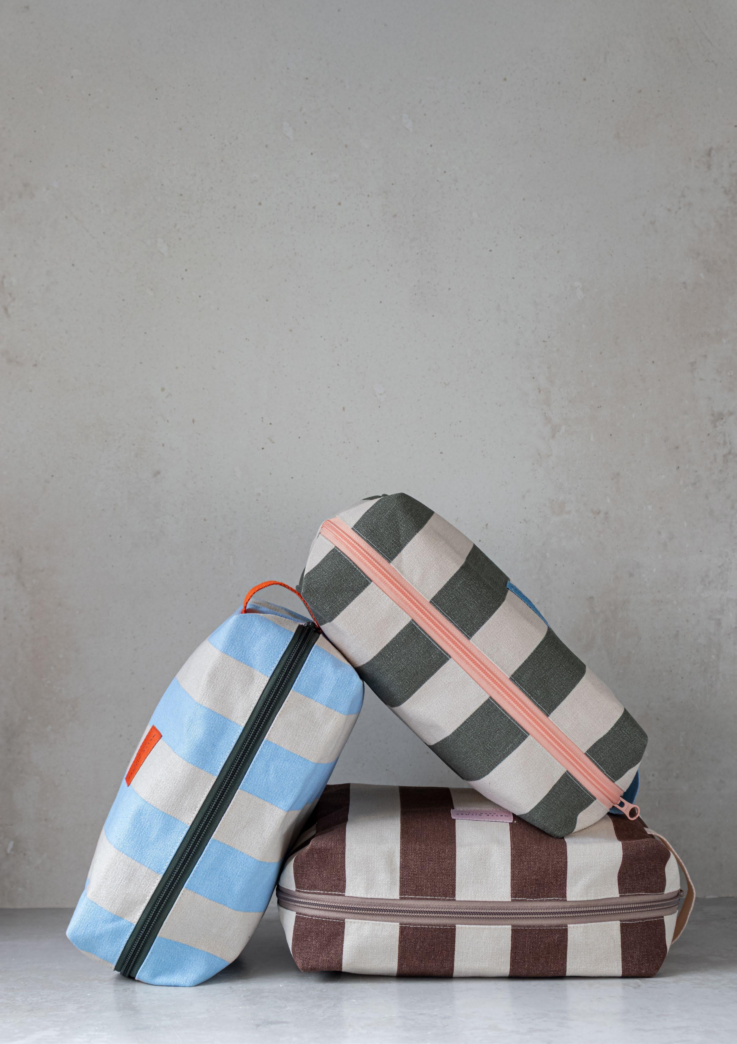 BRING-IT is a series of functional and durable toiletry bags, designed for use at home or on the go. Made from heavy-duty cotton canvas with wide stripes on a sand-coloured base, the bags feature playful contrast details that give them a graphic and contemporary look.
