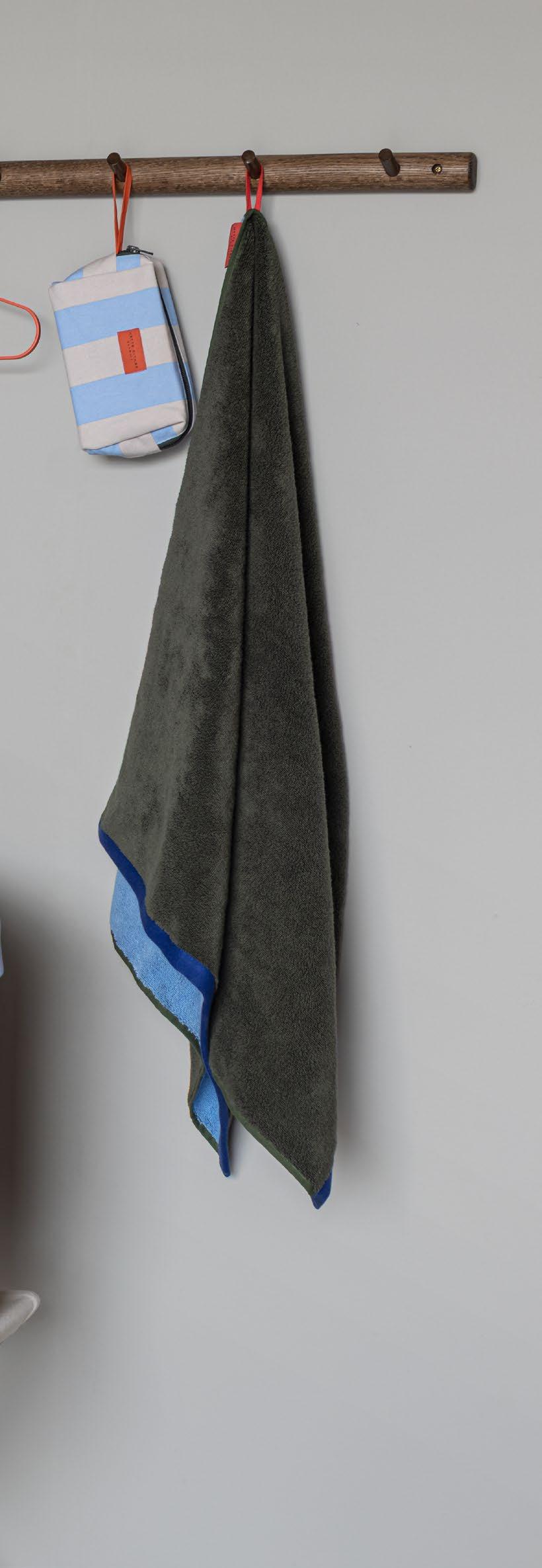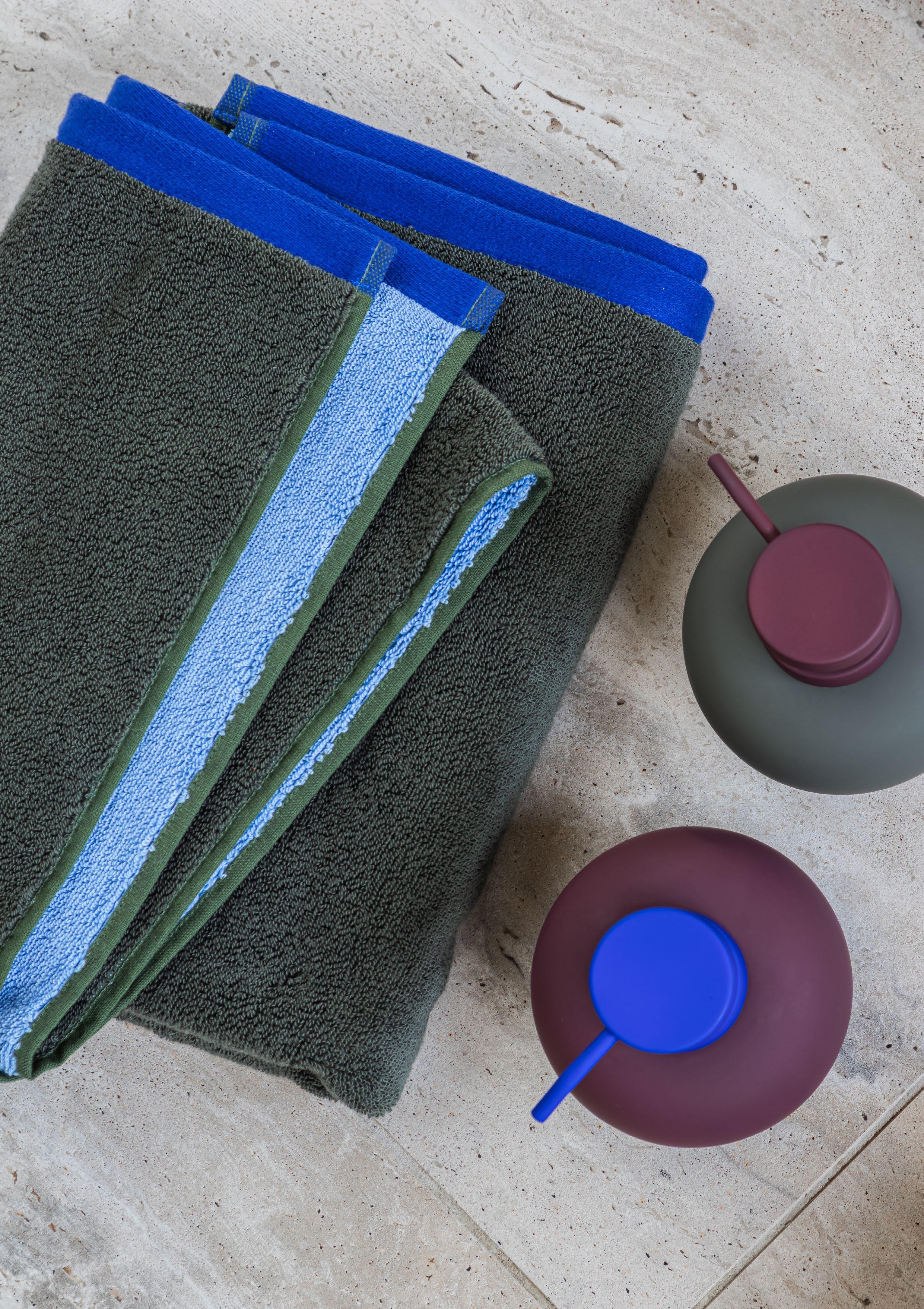 The SOFT towels are woven from extra soft, heavyweight cotton with a breathable texture and high absorbency. The loosely spun yarn and dense weave give the towels a plush, almost fluffy feel – like a luxurious spa experience at home. The towels feature a double-sided design in olive green and light blue. A cobalt blue trim offers a balanced contrast and ties the colours together. The calm design includes a subtle play of colour that adds visual interest without being overpowering. 100 % organic cotton, OEKO-TEX® 100 certified. For maximum absorbency, soak the towel in cold water for 24 hours before first wash. Avoid fabric softener to preserve the towel’s natural qualities and long-lasting softness.