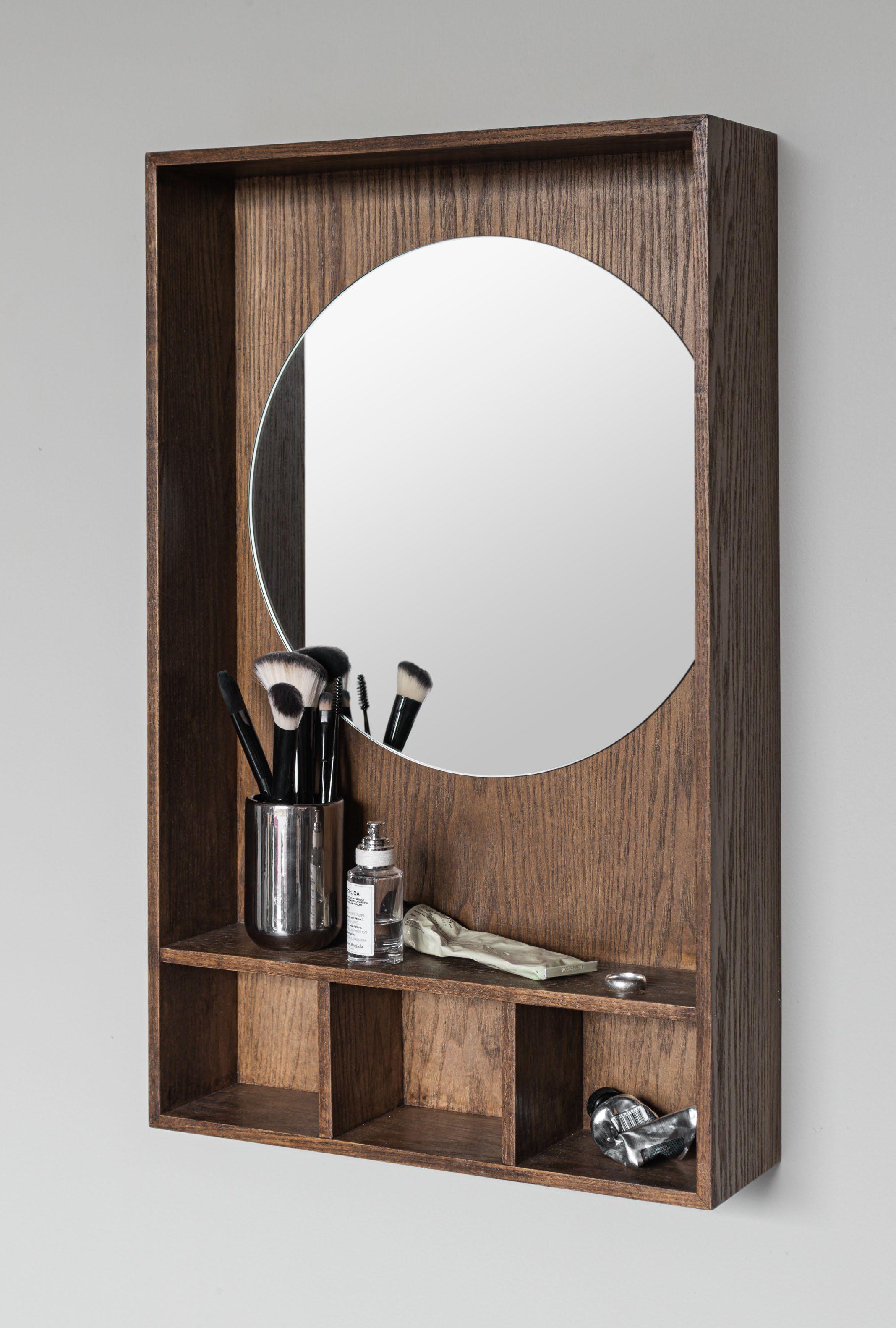 A statement piece with a nod to the past. The SHOWCASE mirror shelf reimagines the iconic 1970 s design – nostalgic in character yet made for contemporary living. A large, circular mirror is combined with a shelf and smaller storage sections in dark-oiled oak, offering space for everyday essentials and decorative objects. Available in two sizes, the mirror can be mounted horizontally or vertically using the included wooden blocks, and features hidden fittings for a clean, understated look.