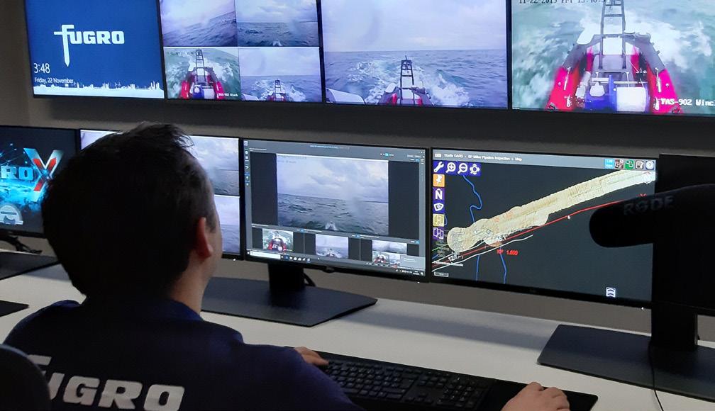 competitors. A perfect example is Fugro’s world-class ROC in Aberdeen. Using this ROC, Fugro’s clients could track the status of any service they recently contracted, such as the ongoing progress of inspections and surveys or the realtime status of ROVs on the ocean floor. Thanks to this ROC investment, remote solutions could be offered through a minimal amount of bandwidth and additional equipment. More remote monitoring and management options translate into fewer onsite inspectors and managers, which became crucial during the pandemic. How small a crew is needed to work in offshore environments is the No. 1 factor that determines how safe an operation is.