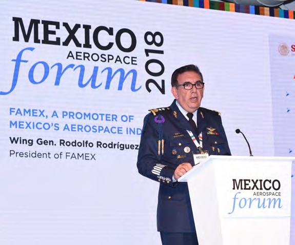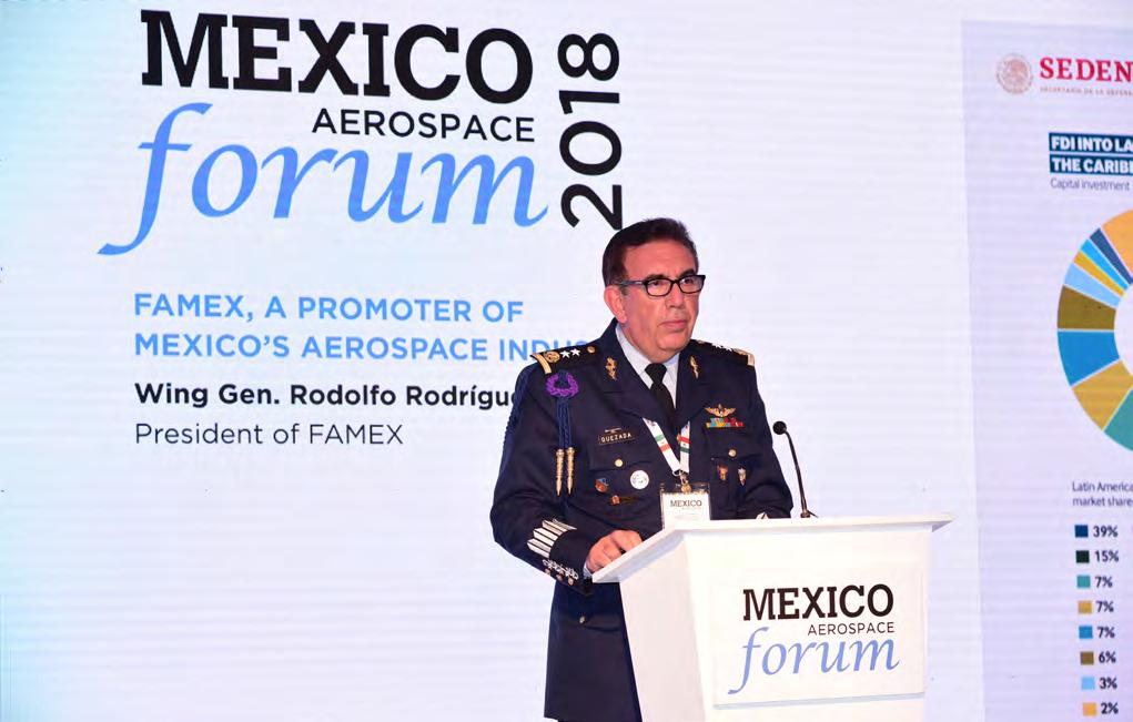 The Aerospace Fair of Mexico (FAMEX) provides a key space to promote trade and growth of the national aerospace industry in Mexico and abroad, explained Wing Gen. Rodolfo Rodríguez, President of FAMEX in his presentation at Mexico Aerospace Forum 2018 at the Hotel Sheraton María Isabel in Mexico City. “It is the biggest aeronautical event in Mexico and one of the biggest in Latin America. It is a key event to support Mexico’s growing opportunities in the sector,” he said.