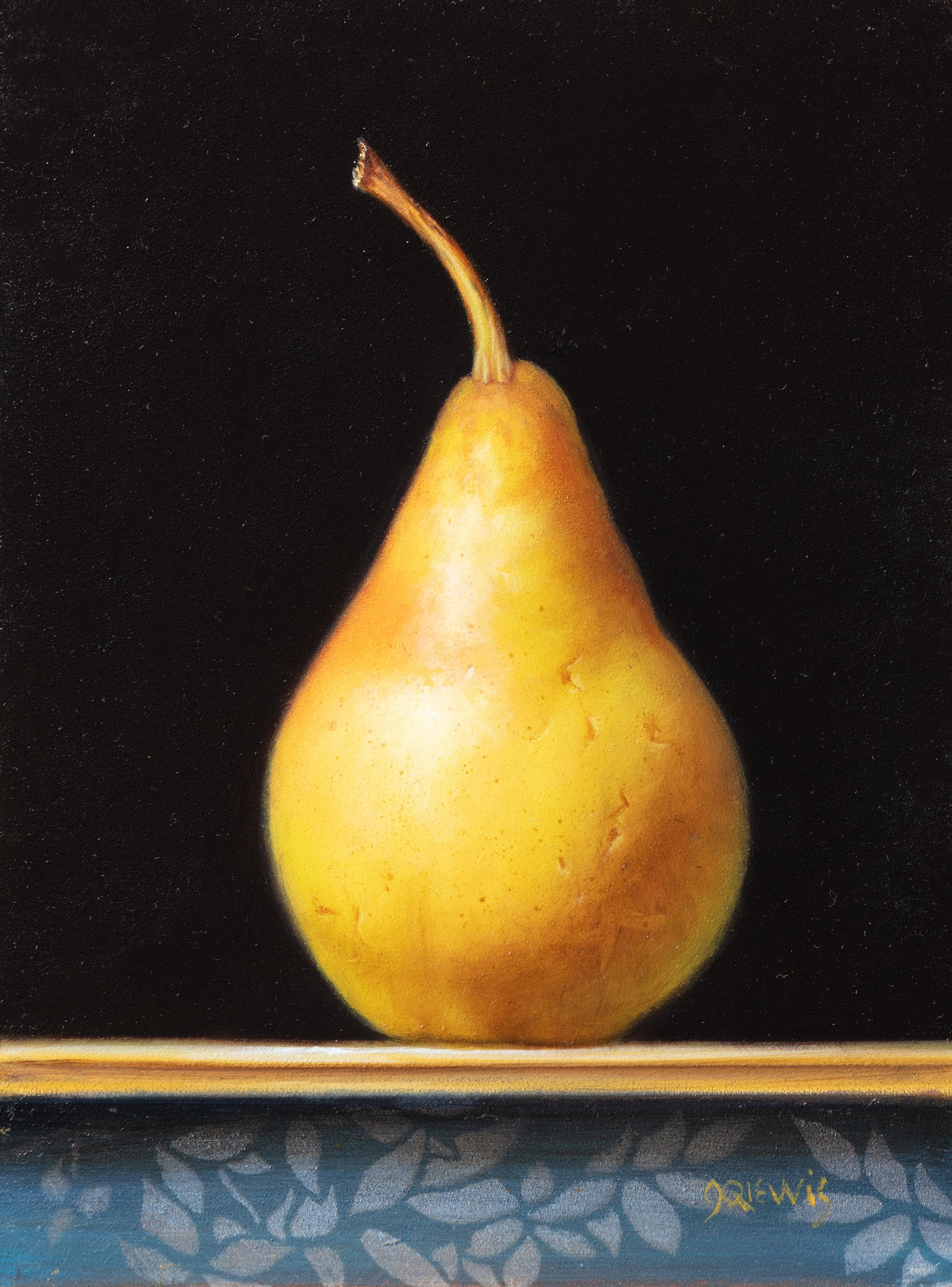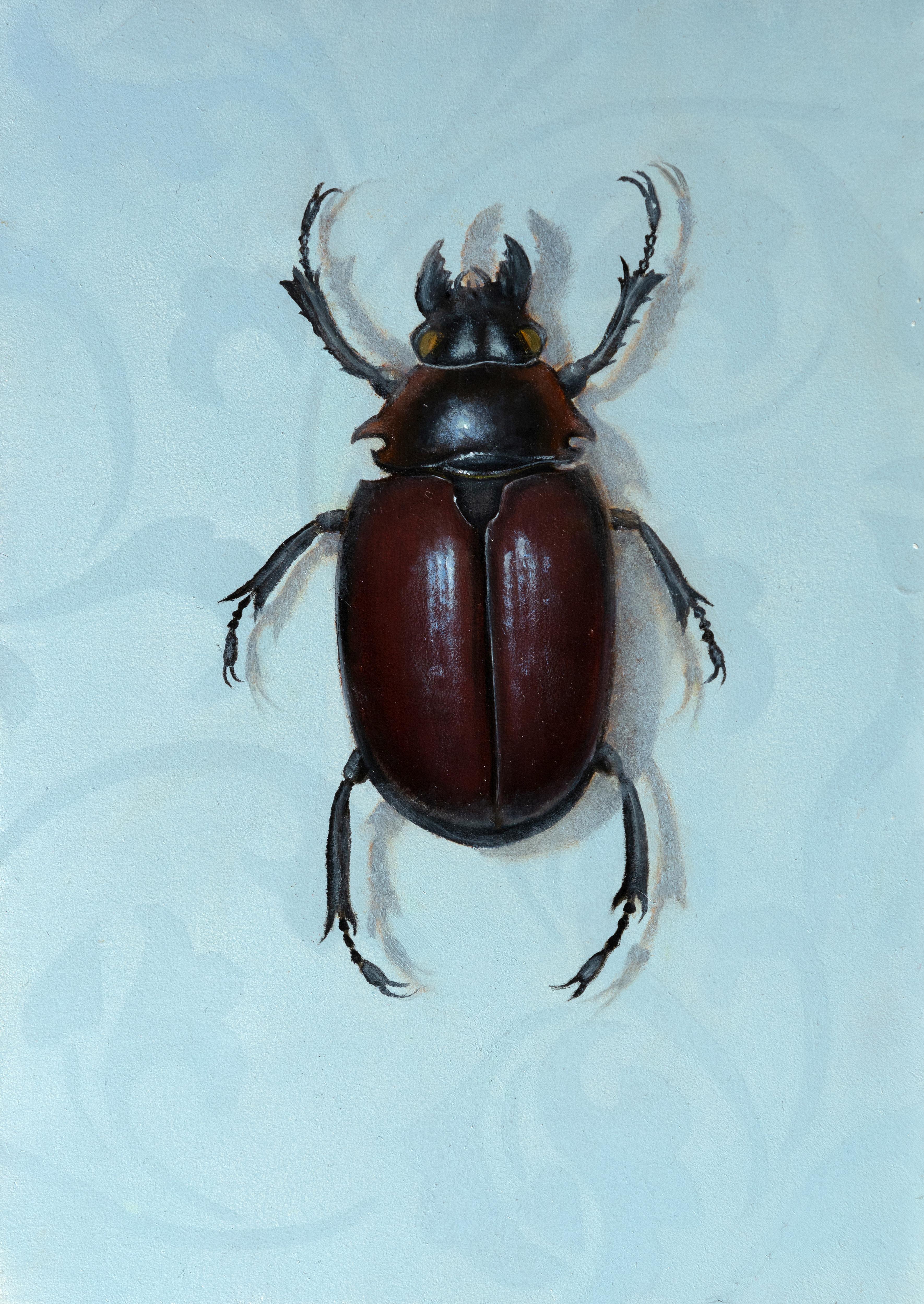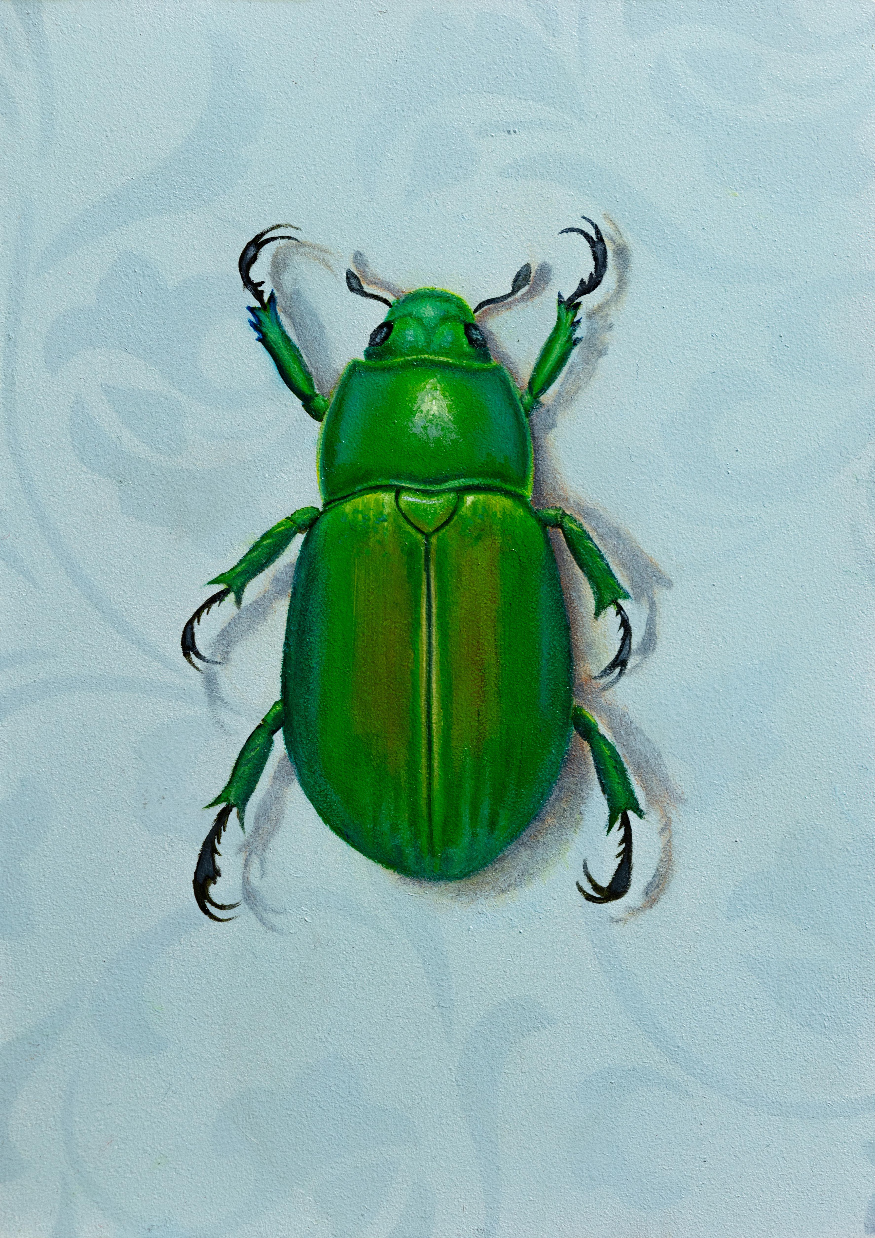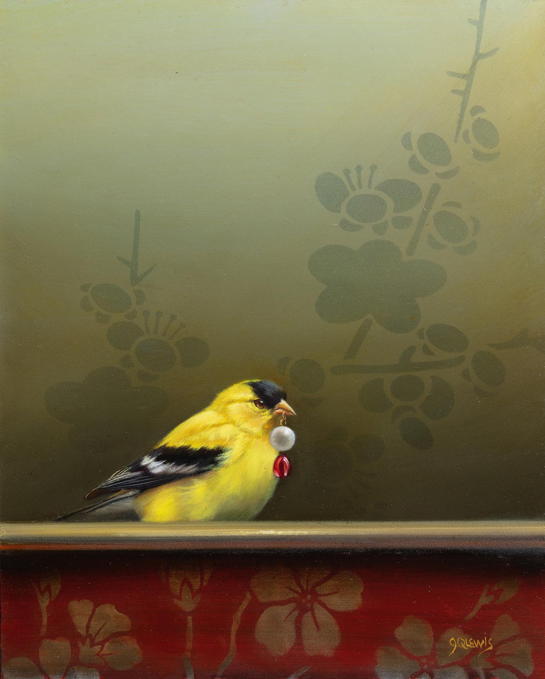 For her 2022 solo exhibition, Avifauna – A World Within, Jhenna Quinn Lewis presents a new series of paintings that reflect the beautiful interdependency between humans, flora, and fauna, rendered in a Japanese-inspired aesthetic. Her paintings move the viewer to acknowledge and appreciate our place in nature, while inspiring us to do our part in protecting it. Lewis’ subject matter is still dedicated to songbirds in still life, however, for this exhibition, she also presents each of those subjects individually with quiet still scenes focused around a single piece of fruit, or a detailed image of a bird against solid or patterned backdrops. Lewis brings more focus to her singular subject as it fills the canvas, asking us to pause and consider its beauty and presence. Subtle symbols represent the subject’s connection with nature; Garden’s Gift, for example, shows a single stemmed pear with two green leaves as if it were just harvested from a tree. It sits on a red surface that is patterned with butterflies – representing the insect that assist with orange tree pollination to produce this “garden gift.” Still I Wait depicts a Golden-crowned Sparrow who carries a jeweled earring in its beak, a memento from a human environment. The background design is a soft image of morning glories that vine down to frame the avian subject, who sits on floral painted surface. This whimsical scene is, according to the artist, “a representation of how our worlds are connected.” Other pieces in the show inspire us to take an even closer look into the natural world with an insect series titled Bug Collection, featuring smaller, hyper-detailed paintings of beetles and butterflies.
