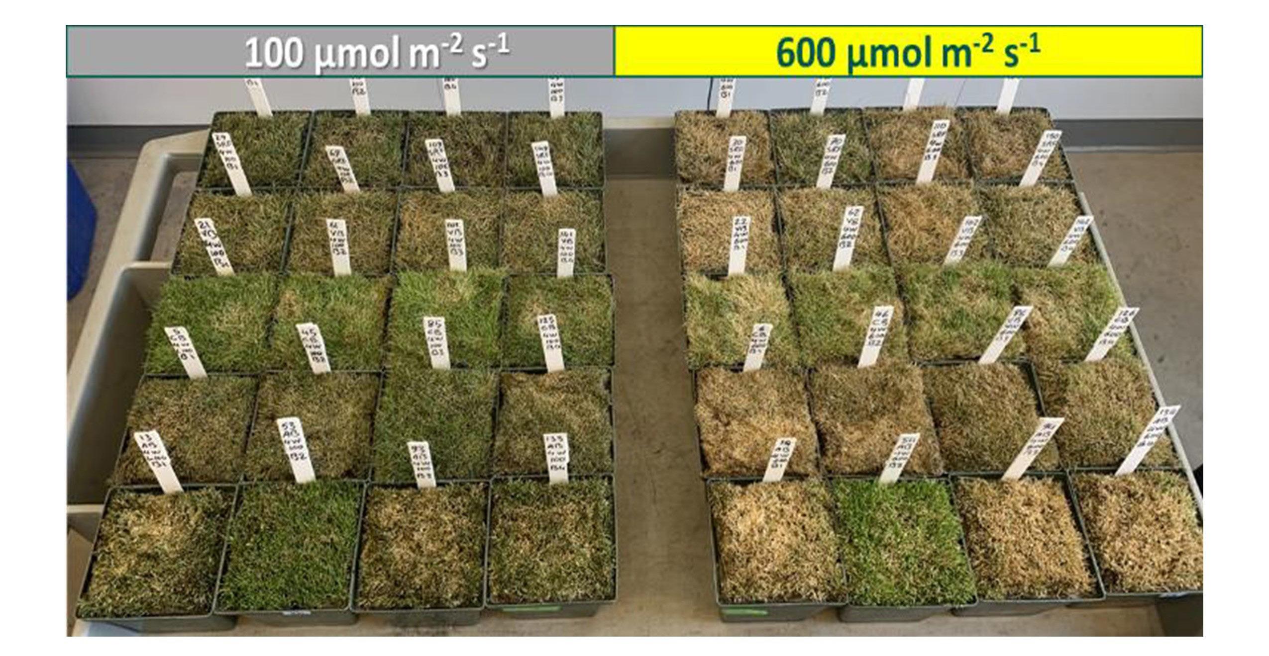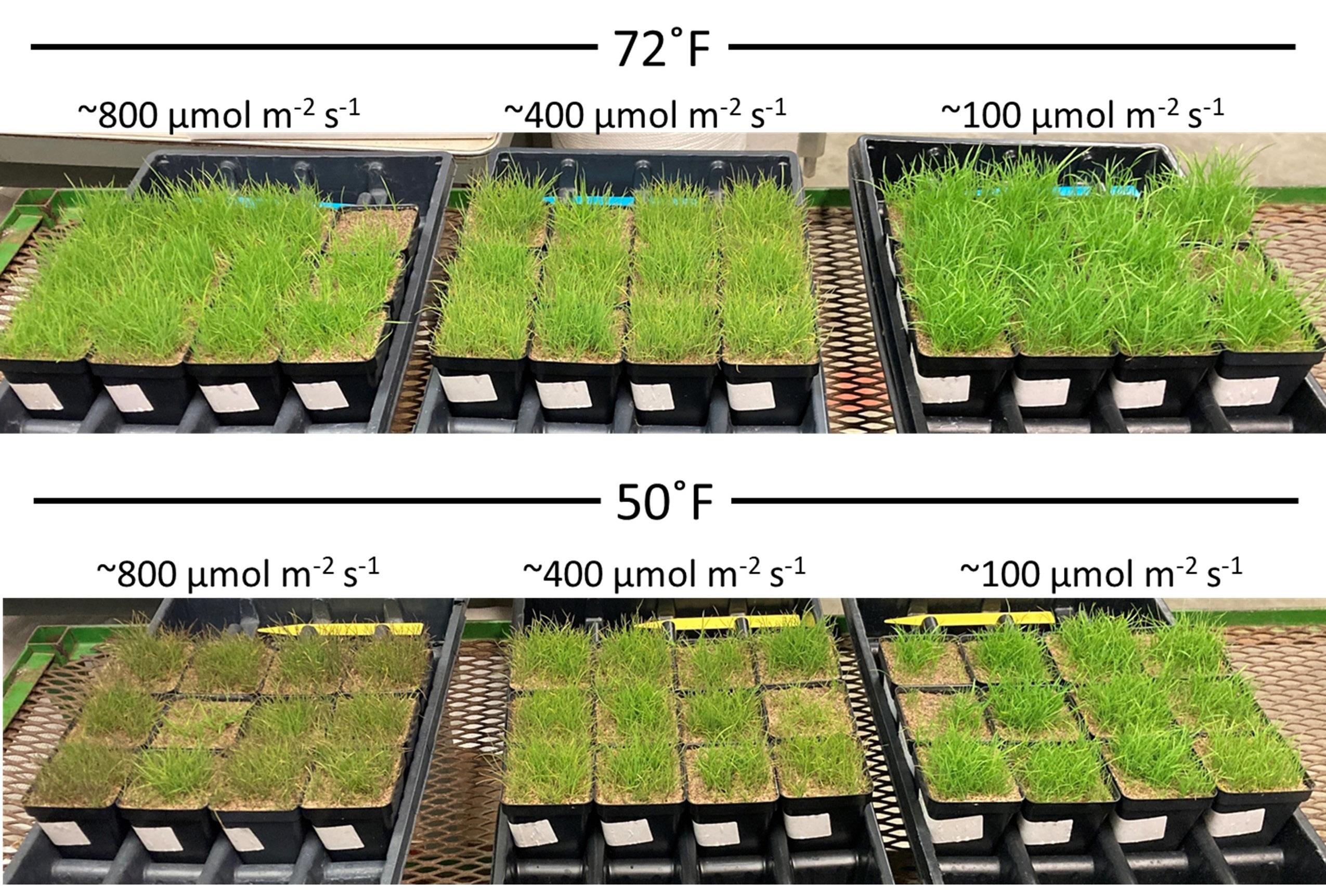 Photo 1: Creeping bentgrass exposed to low (100 µmol m-2 s-1), moderate (400 µmol m-2 s-1), or high intensity light (800 µmol m-2 s-1) while growing at optimal (72°C) or low air temperaure (50°F).