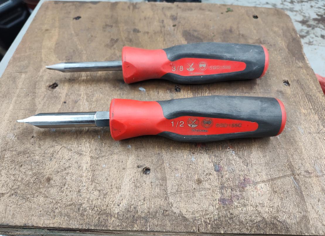 The first tool (below & right) is one I stumbled upon while going to college in the Marine, Motorsport and Outdoor Power Equipment Program. Drain plug screw drivers for lower units on boat