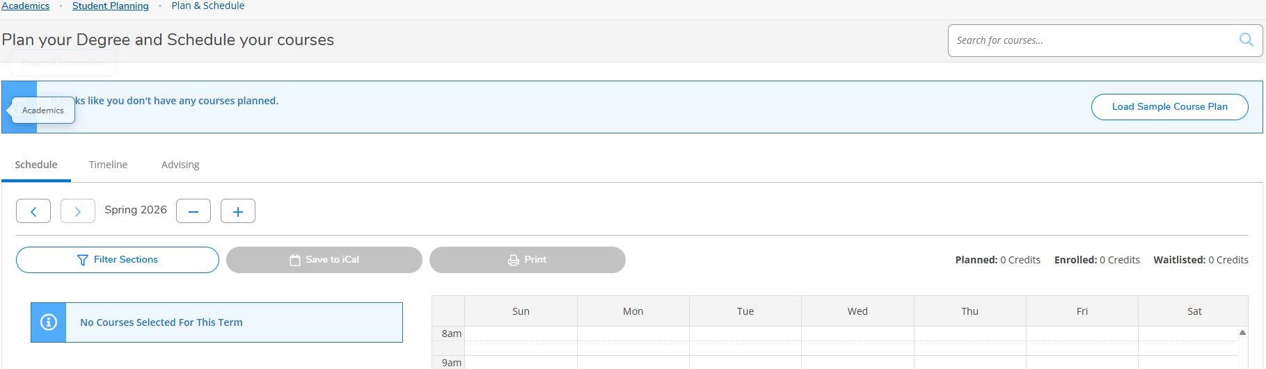 4) Once you have logged in, click on “Academics” in the left sidebar and under “Student Planning”, choose ‘Plan & Schedule”.