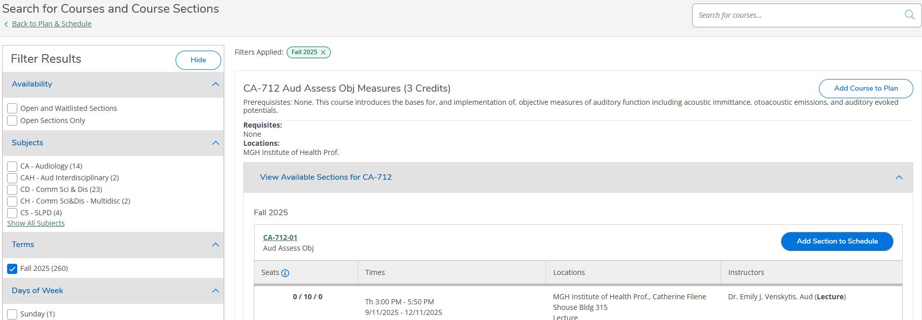7) After you have filtered your choices, you will be able to “View Available Sections” (Step 1) for your filtered choices and then “Add Section to Schedule” (Step 2). When adding a section, a dialogue box will appear with section information and the option to “Add Section”. Once you have completed adding sections to your schedule, click “Back to Plan & Schedule” (Step 3) to finalize and complete your registration.