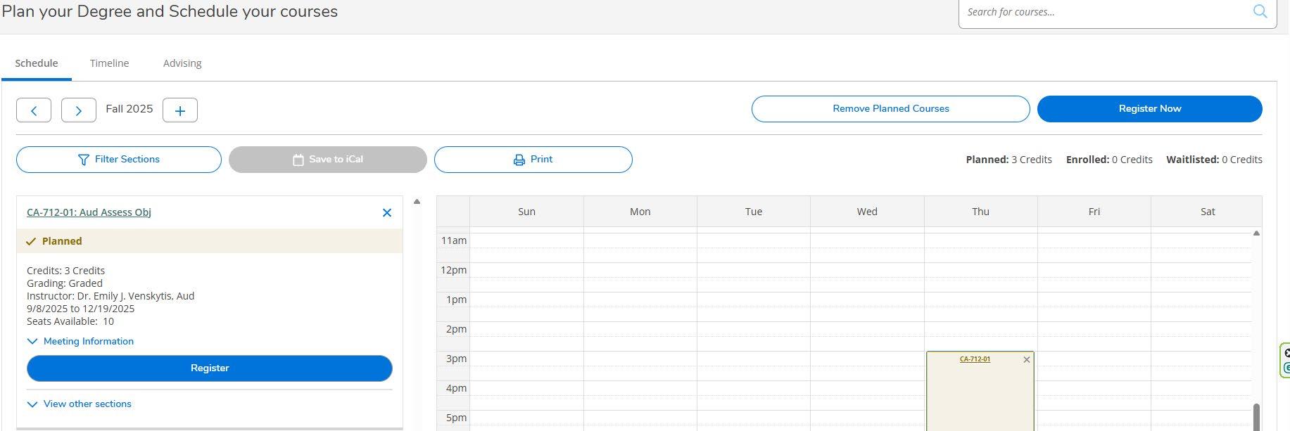 8) After you go “Back to Plan & Schedule”, you will see that your selections have been added to your plan for the semester that you are registering for. To complete registration for all sections in your list, click on “Register Now” in the upper right. You can also register section by section by clicking on “Register” in the left sidebar where your section choices are listed.