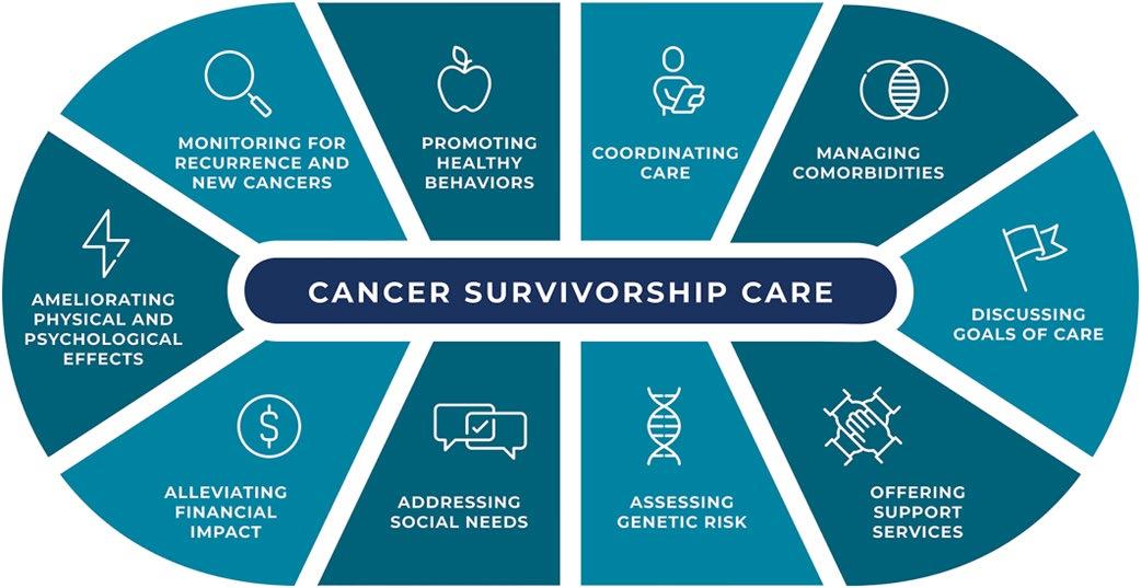 Figure 2. Definition of cancer survivorship care: cancer survivorship care is comprehensive care for all people with a history of cancer and begins at the time of diagnosis, with the goal of assessing and mitigating the impact of cancer and its treatment.