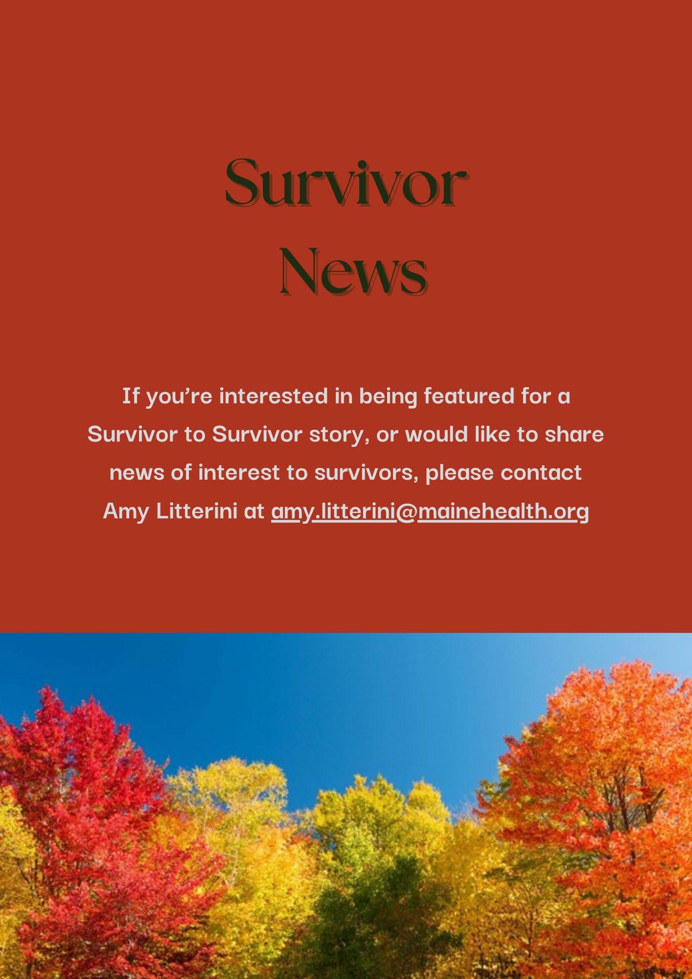 Welcome to the fall edition! We hope this finds everyone ready for this beautiful season in New England. If you haven’t already, please sign up here for future editions. This quarter, we’re covering all the great summer and early fall events, as well as recent publications about cancer survivorship. If you would like to share your story, or have ideas for content, please feel free to reach out to amy.litterini@mainehealth.org. Enjoy this amazing season!