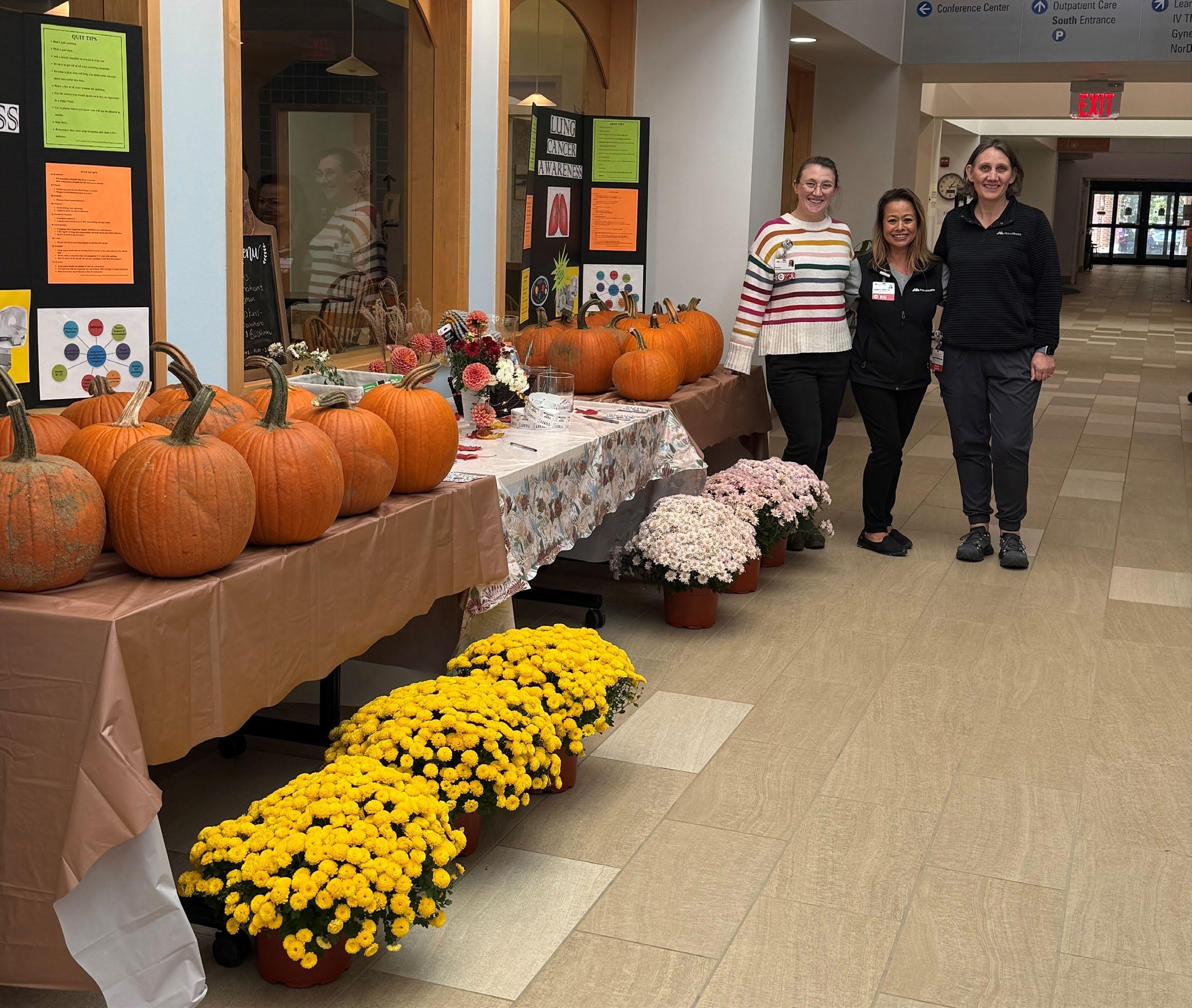 On September 18th Broadway Gardens in South Portland donated mums to our Lung Screening Program at our 100 Campus Drive location in Scarborough. Then on October 9th Scarborough’s Highland Farm and Garden Center donated pumpkins, and Broadway Gardens also donated beautiful mums, all for sale by donation. SiteOne Landscape Supply coordinated the donations, and donated the Thoracic Oncology team hats for the Save Your Breath 5K fundraiser. Proceeds from all the efforts are designated for patients receiving lung cancer screening, as well as for those needing financial assistance to cover CT chest images due to suspicious findings on their lunch screening scan. A total of $1,427 was raised over the two events. Shown below are Kaylee Mutrie, Snow Tardiff and Hanna Mutrie of the Thoracic Oncology Program.