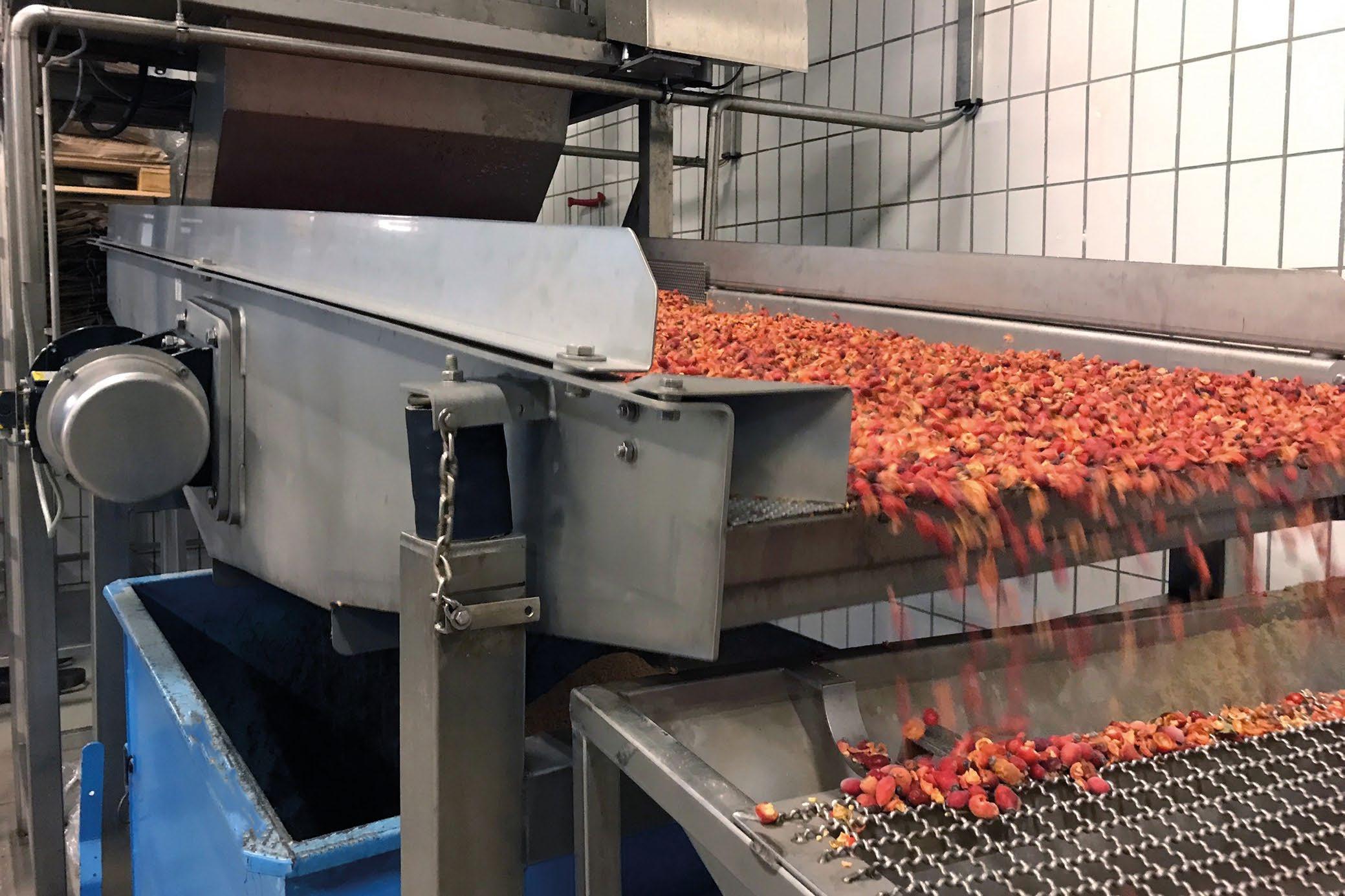 A jam manufacturer needed to separate rosehip pulp from seeds and clean them for oil pressing. Using a custom vibrating sieve trough powered by electric and pneumatic vibrators, NetterVibration achieved neartotal material utilization—with minimal waste and maximum product quality.
