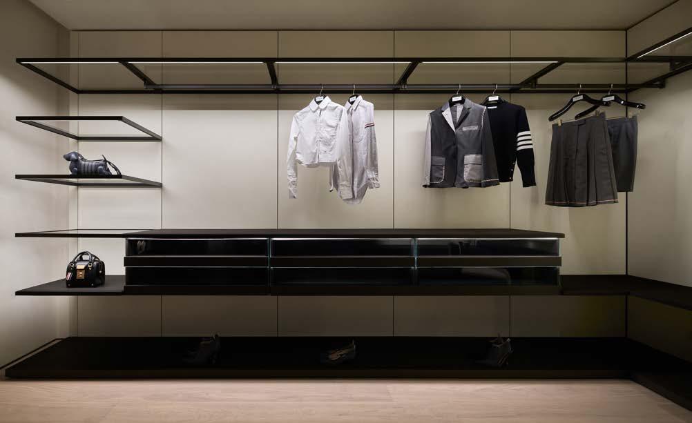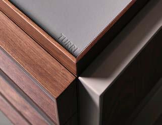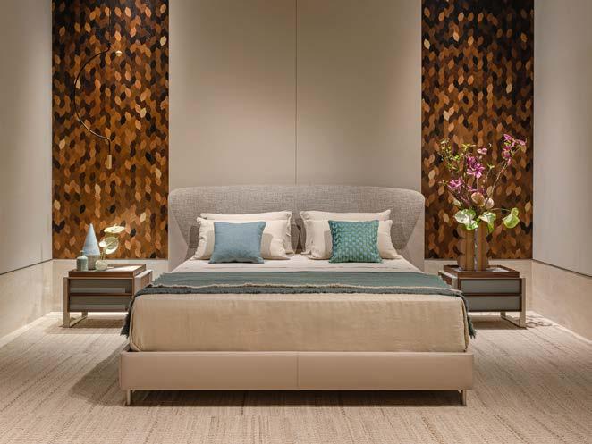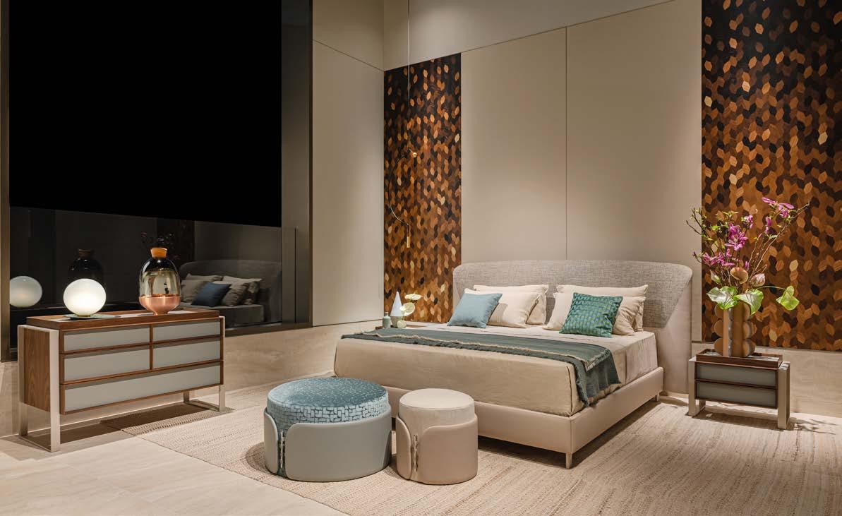 It is combined with the Boiserie Storage with moka metal details, shelves, and drawer units in eucalyptus23 melamine with glass fronts, which emerge as architectural volumes from the crema matt lacquered backs, enhanced by the new integrated lighting.
