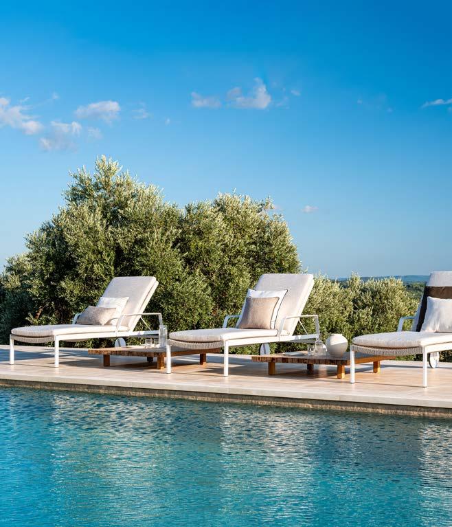 Characterized by a tubular aluminium structure with minimal design, Tressé is an elegant and comfortable outdoor product family that allows multiple compositions to meet the most different space needs. Completely customizable, it bets on the ecoleather interlacings to give life to a complete and versatile proposal. The cozy sofa combines perfectly with the original coffee tables and a glamorous and sophisticated dining area. Stylistically unmistakable, it accords to the Talenti style, expanding its ideal influence pool to undo preconceptions and stereotypes. Eco-leather is rediscovered as an identifying element in the sun bed and pouf where the interlacing appears even more seductive and versatile.