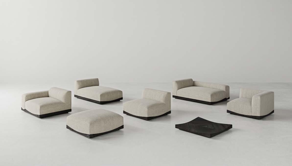 The Stilt collection includes a sofa module, an armchair with a footrest, a chaise lounge, a series of tables, and a bed. The structure of the sofa and armchair features cushions that delicately rest on a curved wooden base covered in handcrafted leather or fabric. The chaise lounge draws on the construction know-how of the seats, reworked with a new modifiable comfort through the movement of the rocking element and welcoming base support.