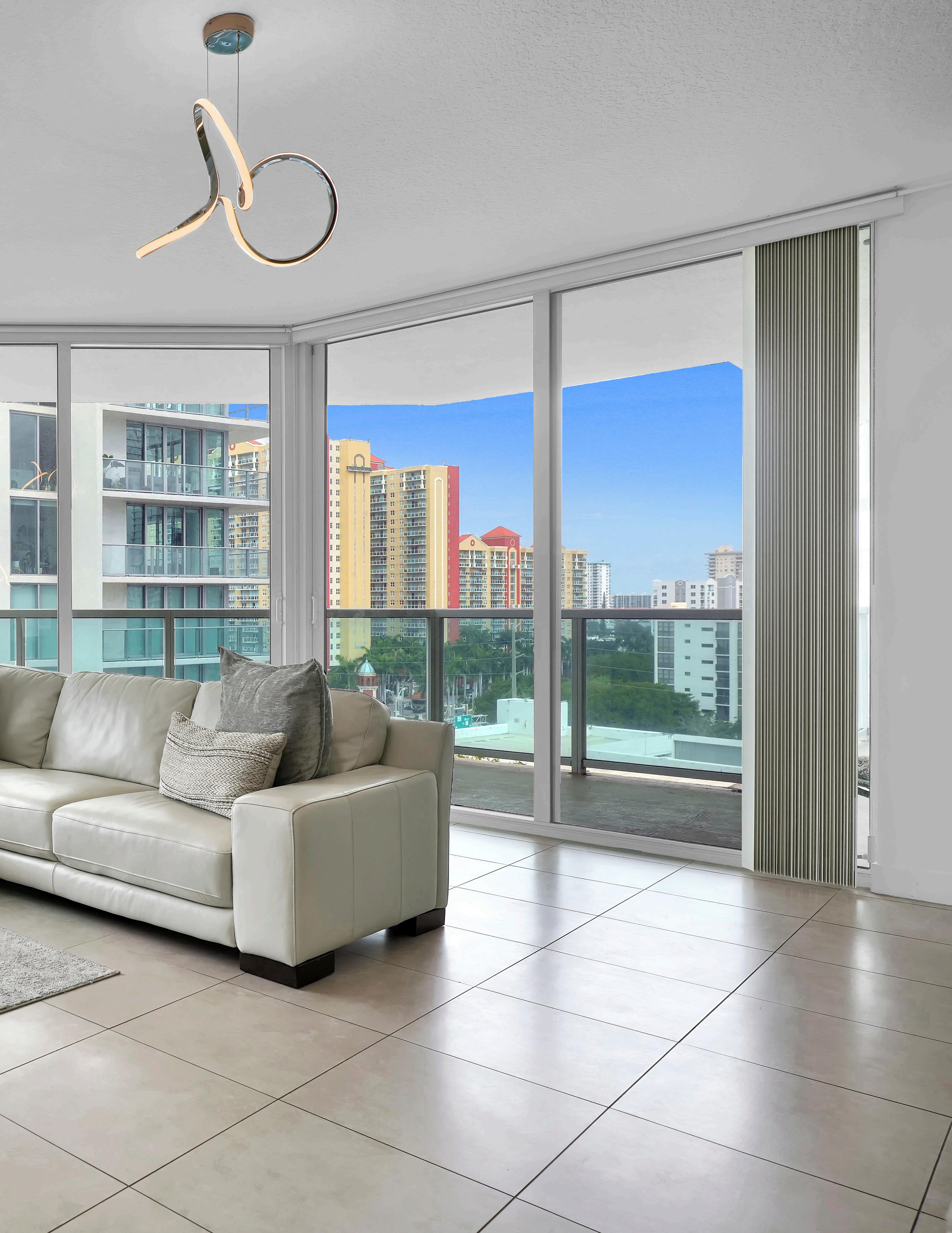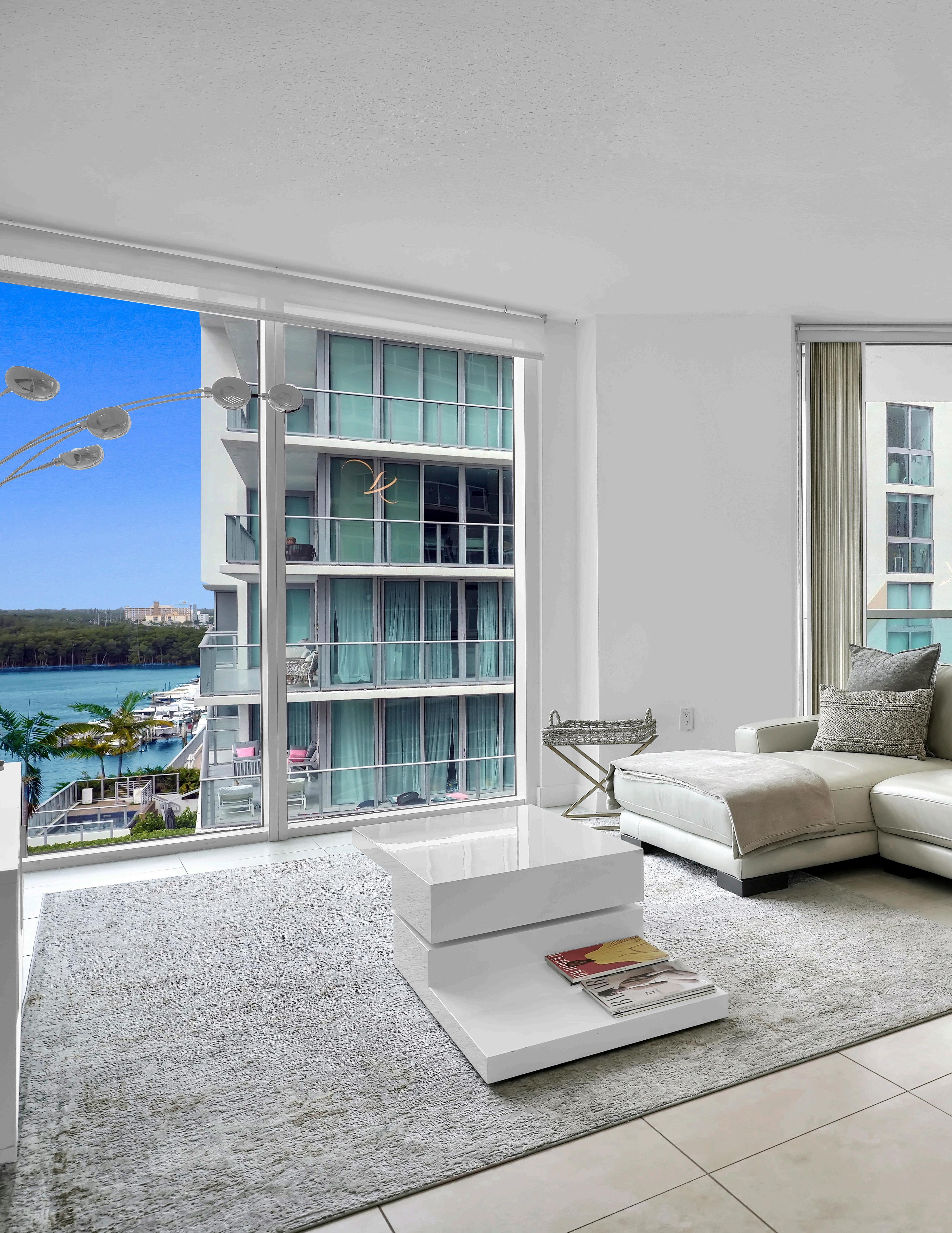 Step into this modern, light-filled living room, where floor-to-ceiling windows showcase amazing city and water