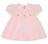 A timeless Valentine’s Day gift, this vintageinspired dress celebrates love with heirloom charm. Perfect for photos or special moments, it features a scalloped ruffle collar, honeycomb smocking, rosebud embroidery, and basket-weave ribbon. Sizes 3M–9M include panties; 12M–4T tie with a sash.