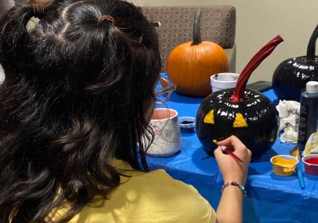 BY ASHLEIGH BRELAGE A RESIDENT ON CAMPUS PAINTING THE SMILE ON A SPOOKY PUMPKIN. PHOTO BY ASHLEIGH BRELAGE