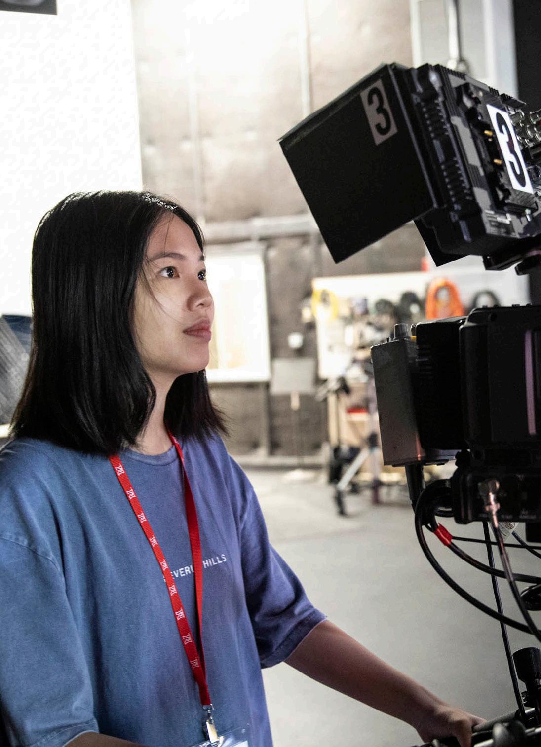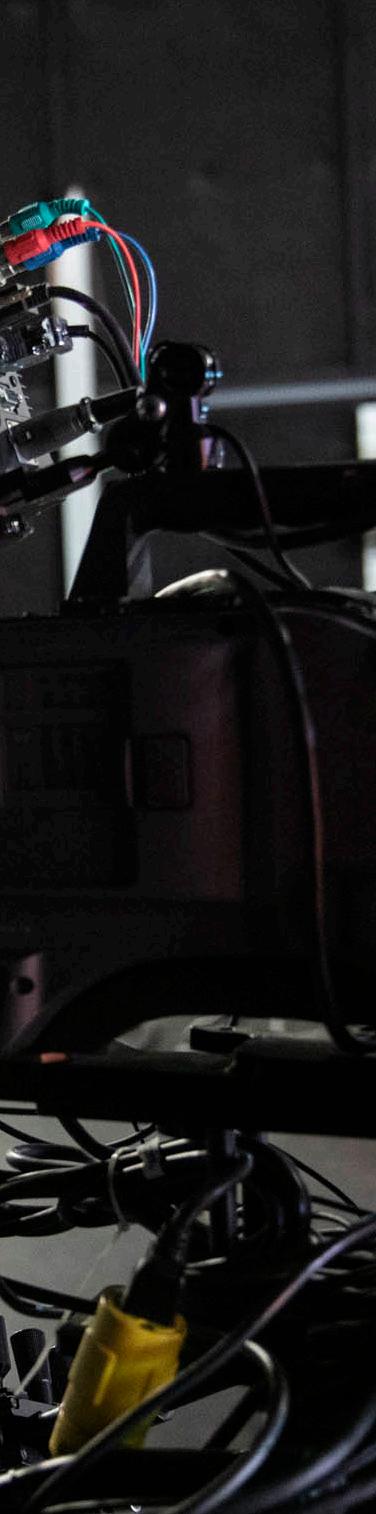 A student operates a professional TV camera inside the Department of Media, Journalism and Film’s