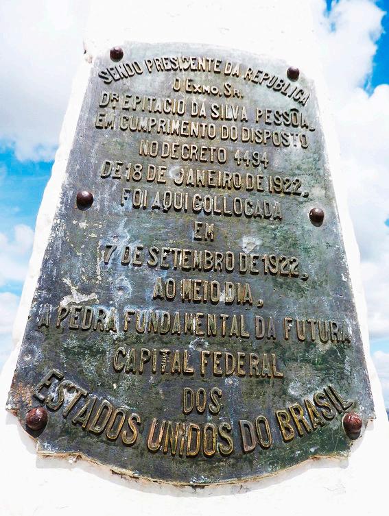 Sendo Presidente da República o Exmº Sr. Dr. Epitácio da Silva Pessoa, em cumprimento ao disposto no Decreto 4.494, de 18 de janeiro de 1922, foi aqui colocada em 7 de setembro de 1922, ao meio-dia, a Pedra Fundamental da futura Capital Federal dos Estados Unidos do Brasil. (VASCONCELOS, 1978, p. 237).