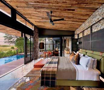The Sossusvlei Desert Lodge is a remote hostelry near an otherworldly wonder: the gargantuan Sossusvlei Dunes. The lodge’s spacious stoneand-glass villas—enfolded by ancient mountains— feature elegant interiors and spectacular views through massive windows. We explore this rugged landscape by foot or on quad bikes, and relax on a private veranda looking across to the almost glowing, barely believable dunes. And when night falls, we gaze at a matchless celestial spectacle from the lodge’s observatory.