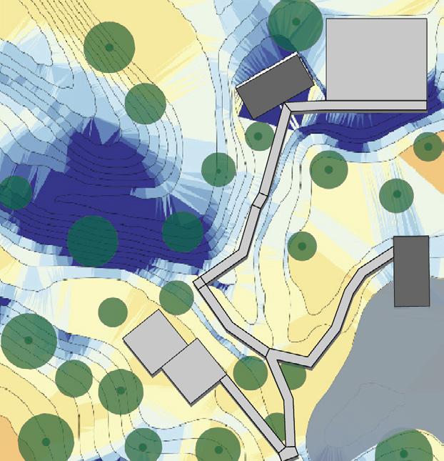 We analyzed this site to determine the paths which runoff with take in precipitation events this data was paired with the slope data to determine the site’s susceptibility to floods and erosion, and to implement strategies to mitigate the impact of these events. Our proposal uses the strategic planting of deep-rooted trees and complementary ground cover plants to help with soil retention in the steepest parts of the site.