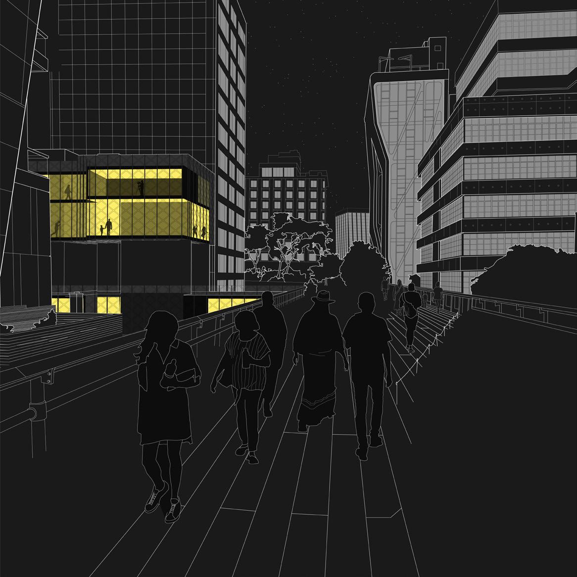 night time view (above) from the Highline showing illuminated, transluscent facade showing activity inside.