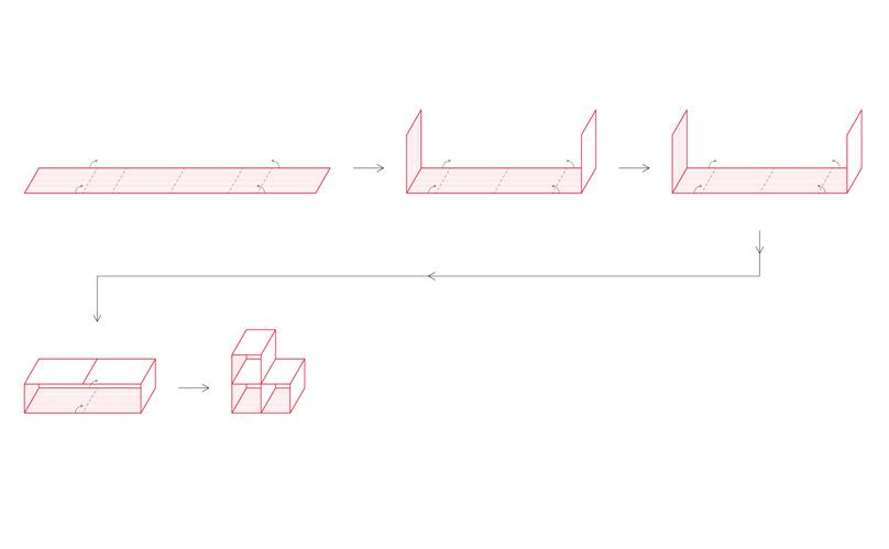 axonometric assembly (opposite bottom) three bands assambled into interlocking structural form.