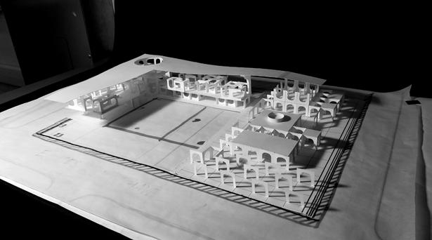 The final model was developed by the full group consisting of two architecture buildings and three landscaped areas of the site. The architectural models were built by their respective designers and the full group of two architecture students and three landscape studends collaborated on the construction of the final site model.