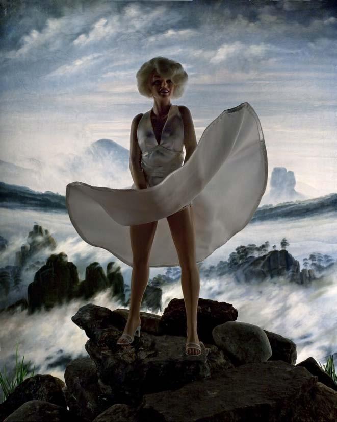 One of the only non-North American art works Thorneycroft employs is her reimagining of German Romantic painter Caspar David Friedrich’s (German 17741840) Wanderer Above the Sea of Fog (1818). Friedrich’s painting of the contemplative individual is a classic work of 19th century Romanticism, an image of human accomplishment and endeavor, juxtaposed against the power and sublime beauty of nature. Thorneycroft deftly inverts Friedrich’s composition, from 19th century masculine circumspection to a 20th century sexualized masculine gaze. By turning the figure toward the viewer, in this case American movie star Marilyn Monroe, Thorneycroft shifts the composition from one of spectator identification to one of objectification. Yet in decontextualizing a familiar image from popular culture, in this case Monroe frozen in a famous scene from the movie The Seven Year Itch (1955), Thorneycroft endeavors to provide her subject with a measure of agency. Monroe, unlike the solitary figure in Friedrich’s painting; who is almost indistinguishable in colour and tone from the jagged rock, is depicted in diaphanous atmospheric white, a figure who in the words of poet John Magee could “slip the surly bonds of earth” and simply float away. Monroe’s cloud-like platinum hair and billowing white dress are extensions of the wind, air and fog, lifting her, it would seem, upward and outward. Nature here is not a metaphor for imminence but rather suggests the possibility of female transcendence contra to the phallocentric logic of modernity depicted by Friedrich.