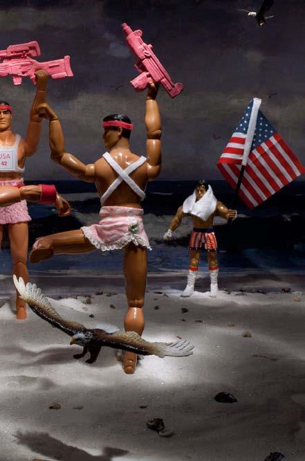 ing these scenarios are action figures and dolls made to resemble movie and television actors depicted in their most celebrated roles. Thus, Clint Eastwood as “Dirty Harry” Callahan, the renegade San Francisco cop, brandishes his .44 Magnum in yet another act of retributive justice; this time against a quizzical and seemingly unarmed meerkat. In depicting the physical asymmetry and disproportionate power between the two figures, Thorneycroft reminds the viewer of the arbitrary strength of US power and authority.