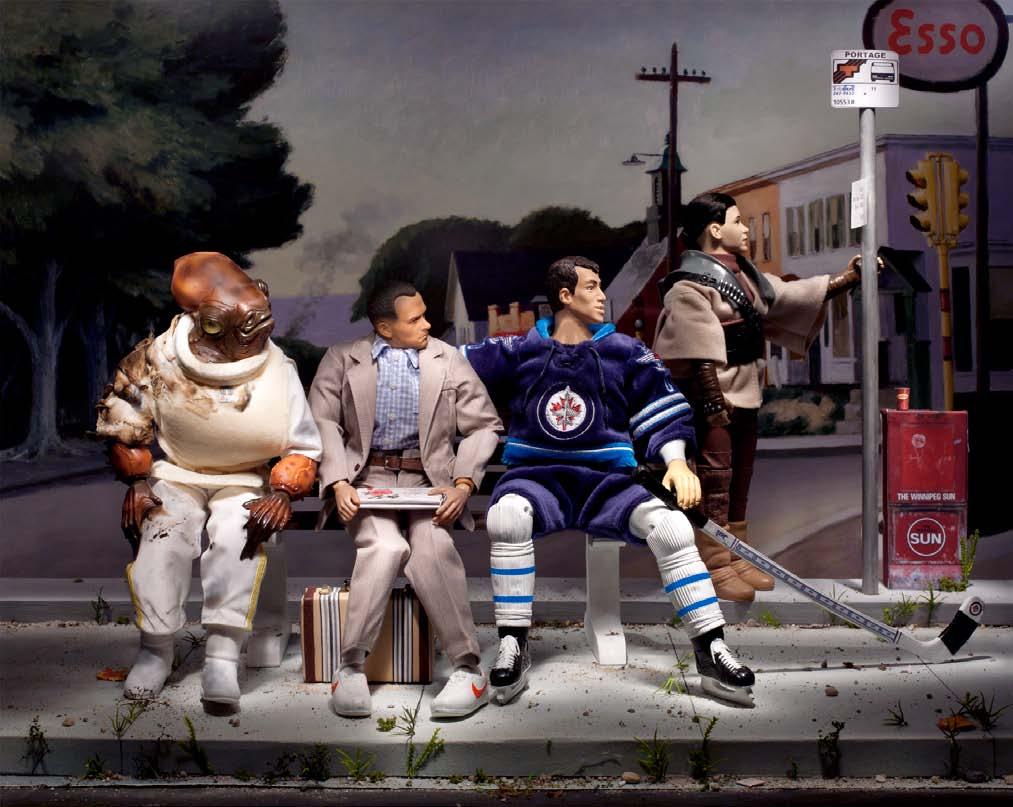 Thorneycroft’s group tableaux are populated with assemblies of men, performing the rituals of male bonding, expressing camaraderie over drinks, or hunting, or in the case of On the Beach (at Gilligan’s Island) ogling the golden beauty of 1970s television star Farrah Fawcett in her notorious red bathing suit. Yet these groups of familiar figures point to one of the most common complications between Canada and the United States; that is the ubiquity of Canada and Canadians within US popular culture and media. Though Canada and Canadians are seen – as locations and actors in films – the nation and its nationals are not recognized as such. Rather Vancouver passes for San Francisco and Toronto for New York just as easily as Kiefer Sutherland (the grandson of Canadian socialist Tommy Douglas) seamlessly passes for a CIA agent using torture to fight the “War on Terror.”