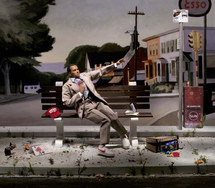 Thorneycroft’s Canada is not a utopian fantasy; the good twin opposite its evil US sibling. In Portrait of Winnipeg (Run! Forrest! Run!) a prostrate and dying Forrest Gump has discovered that life is not a box of chocolates while waiting for a bus on Winnipeg’s Portage Avenue. Instead he is the very real victim of urban violence, dis-