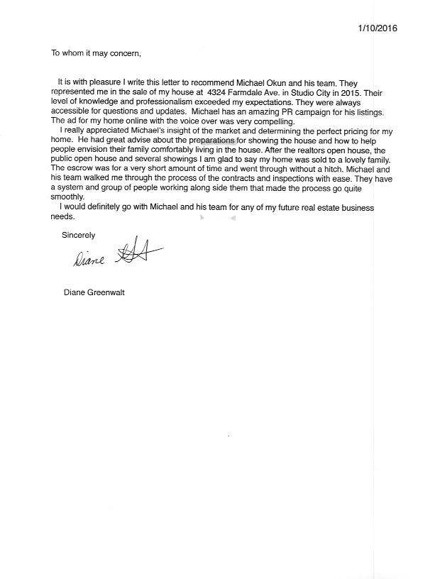 We highly recommend Michael Okun who was our real estate agent when we sold our house on Fair Avenue in Studio City last spring. From the very beginning Michael was enthusiasKc and always responsive to our wishes, and his guidance and wisdom resulted in a sale hundreds of thousand over the asking price. He knew exactly how to stage the house and what fixes and repairs were necessary and which were not. We always felt he gave us his full aPenKon and had our best interests at heart when advising us. His enKre team was great and the people he recommended to do the work on the house in preparaKon for selling were some of the best we’d ever worked with.