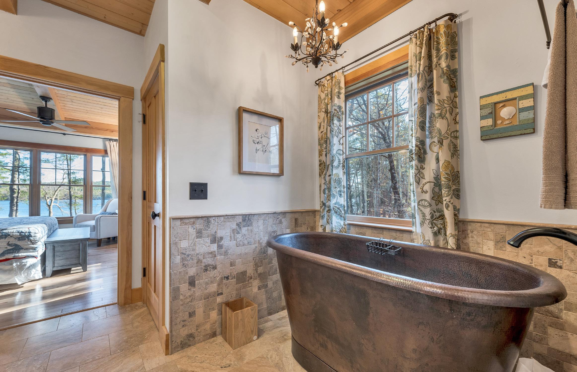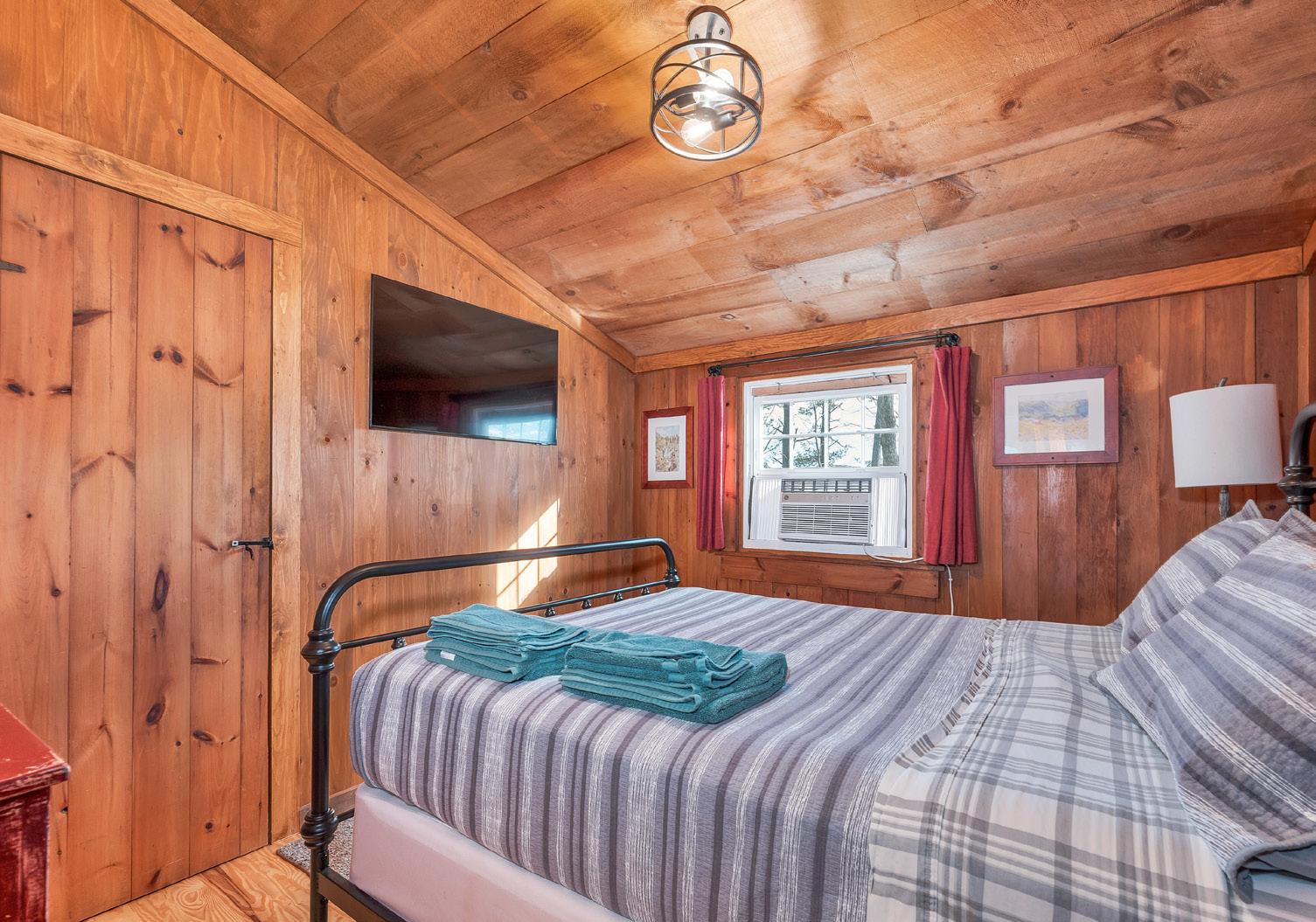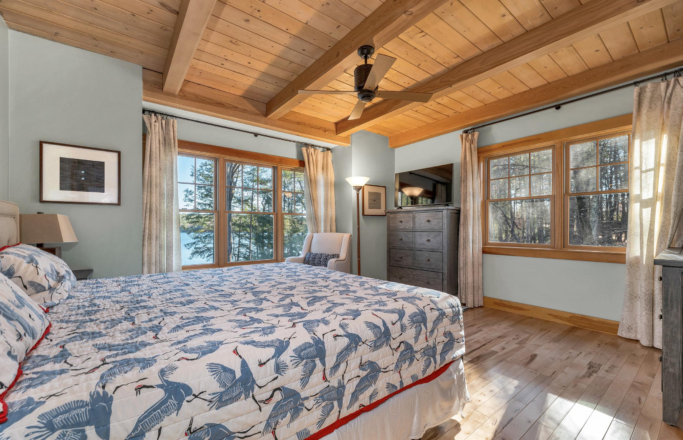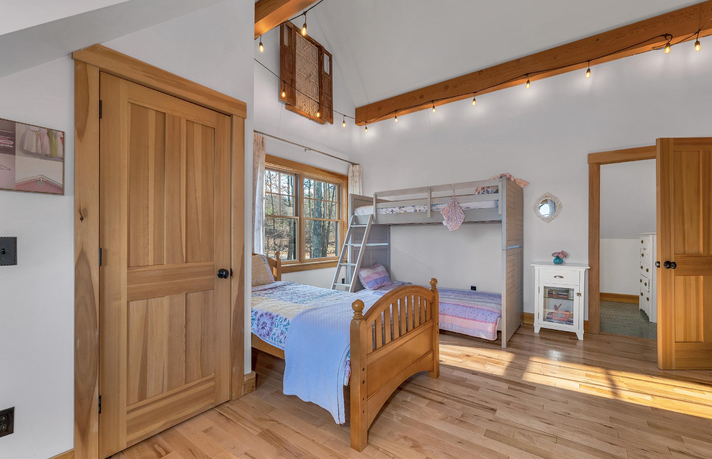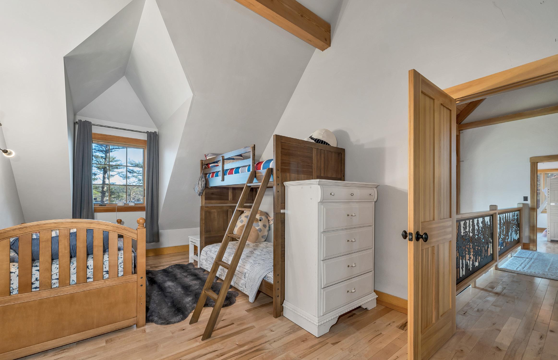 • Upper level “Grey Suite” with large en suite bathroom. Lake views, sliding rustic barn door. Granite Vanity in full bath. 3 beds including bunk bed