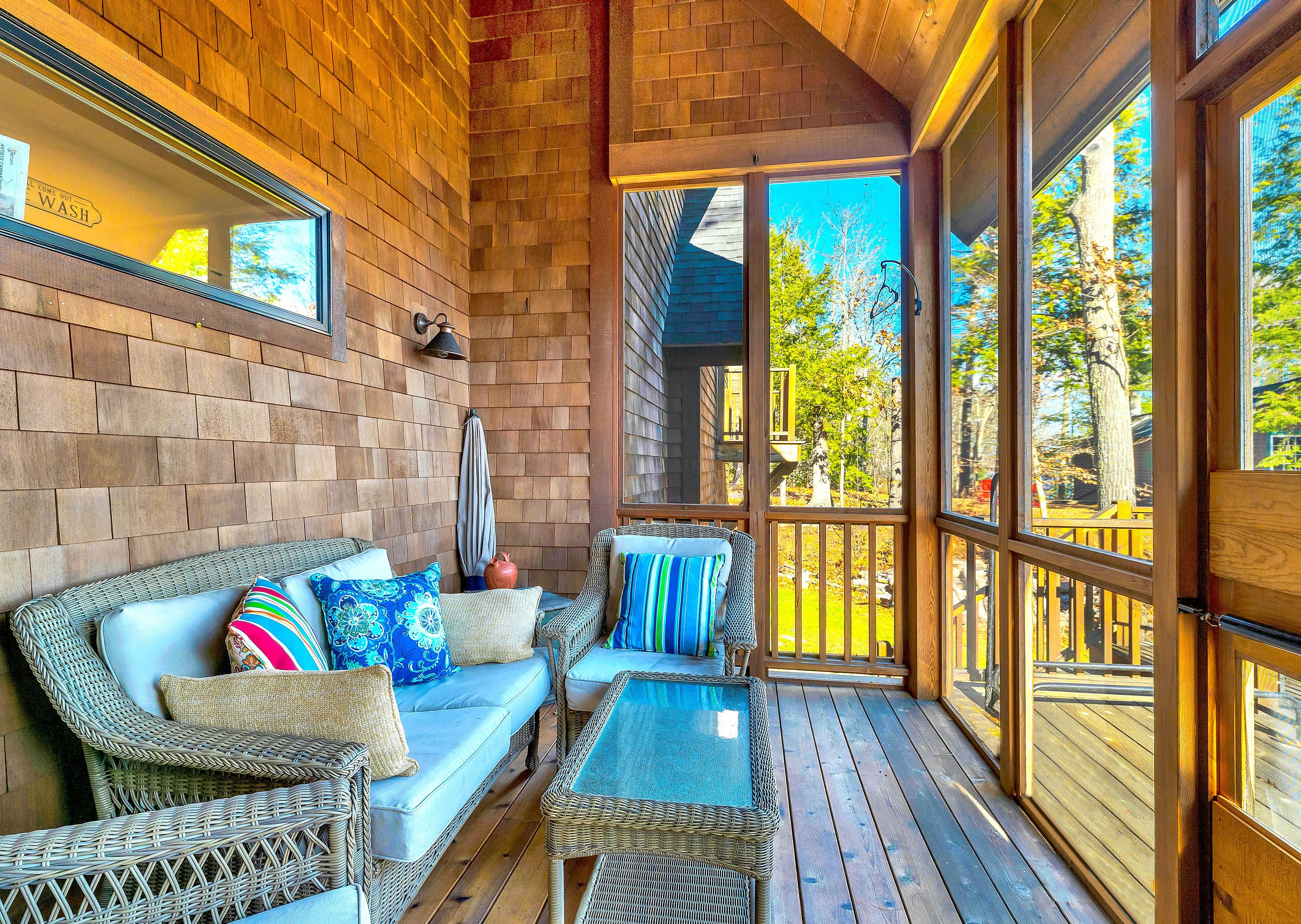 lake with access by double doors from main living room, screened porch and stairway to yard