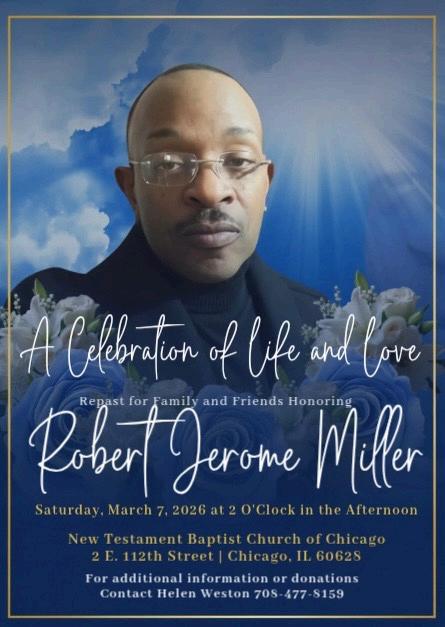 Robert Miller was born in Chicago, IL on December 5, 1965. Rob’s presences always filled every room he entered and he is known his artwork and signature of a moon with the bird flying in the sky . Rob graduated from Sherman School, and quickly became the a standout student at Tilden High School. After graduating from Tilden, Rob enrolled in the Navy and committed his life to military service. While in the Navy Rob received several ribbons, rewards and acknowledgements. Rob continued his education by obtaining an Associate’s Degree in Business Administration, a Bacehlor’s Degree in Business Administration with a concentration in Business Management then just last year, in 2025, he obtained his Master’s Degree in Health Administration from the University of Phoneix. On 12/31/2025, Rob retired from the Lovell Federal Health Care Center - VA