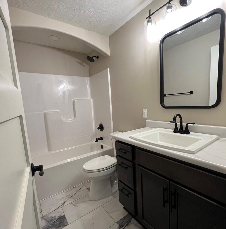 The bedrooms are carpeted for a luxurious and cozy feel. In the primary bedroom, the carpeting flows into the spacious walk-in closet, which also opens into the primary bathroom. The Riff Wood cabinetry, quartz countertops, and contrasting black plumbing fixtures match the rest of the home. The bathroom floors echo the marble countertop pattern and flow seamlessly into the expansive primary walk-in shower. The coordinating shower floor tiles are a mosaic hexagon, while the shower walls are largeformat porcelain tiles with no visible grout lines, creating a clean, contemporary look. Plus, there is a beautiful free-standing soaker tub to melt away the stresses of your day.