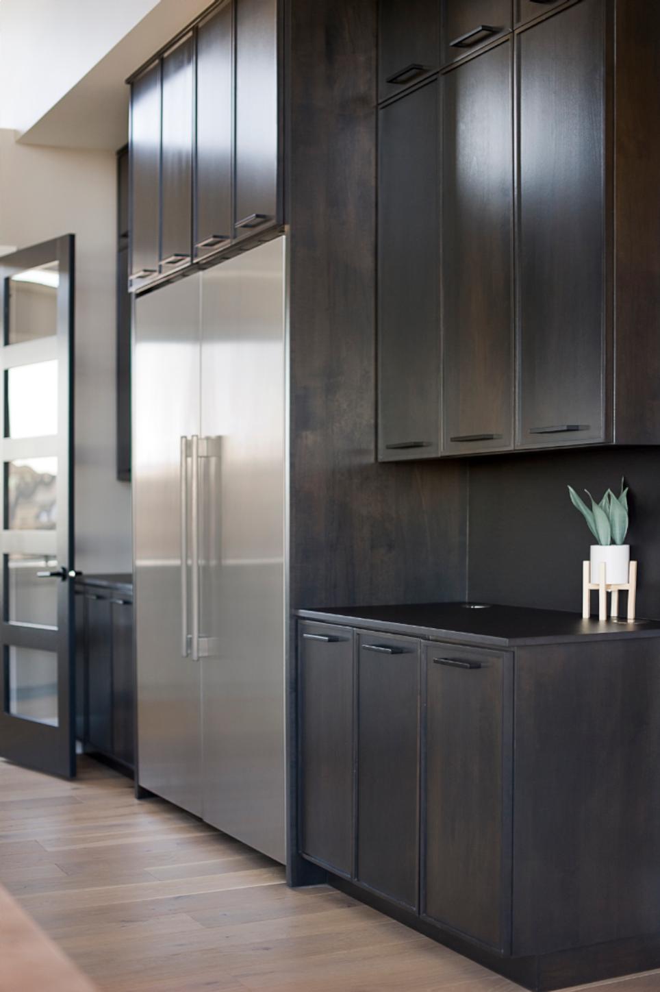 The custom kitchen cabinetry is made of Riff Oak, with contemporary flat panel doors in a warm, caramel-colored finish, punctuated with black hardware to match the black plumbing fixtures in the kitchen and throughout the home. The countertops are a classic white quartz, with soft caramel marbelization. The featured center island has ample space to seat a family of four with a sink, dishwasher, and plenty of food-prep space on either side. The kitchen has impressive storage by way of long drawers below the counters and long expanses of upper cabinets. There is space for a dropin range, a built-in microwave, and an inset counter-depth refrigerator. Tile backsplash in a contemporary soft grey tone gives us a nod to traditional design in its simple and unifying brick tile pattern.