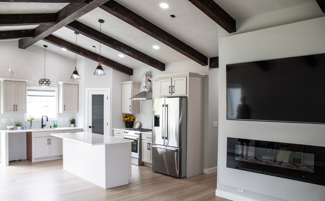 The flooring that unites the spaces is a blonde woodgrain luxury vinyl plank with in-floor heat. Recessed lighting in the vaulted ceilings wash the spaces with uniform light, while the modern black ceiling fan moves the air. The formal dining area features a fun pendant fixture which resembles interlocking, sharp, bands of light, while the three drop pendants over the kitchen island are contrasting half-round, black orbs of light, perfectly balancing the black finish on the kitchen island.