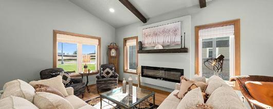 This classy, dramatic slab-on-grade ranch home is stunning and will have you wanting to see more the second you enter the front door. It boasts the latest in flooring, cabinets, light fixtures, colors, and stunning window treatments. This home offers two bedrooms, two full baths, an office, and a four-season sunroom, along with a beautiful backsplash, wood beams, and a fireplace. Additional upgrades include an extra concrete slab on the driveway, epoxy on the garage floor, gorgeous window coverings, and added cabinets in the laundry room. The property also features a huge yard perfect for a garden or play area, allowing you to use your imagination and make it your own. Don’t miss out on this gorgeous home, which also comes with a remaining builder’s warranty.