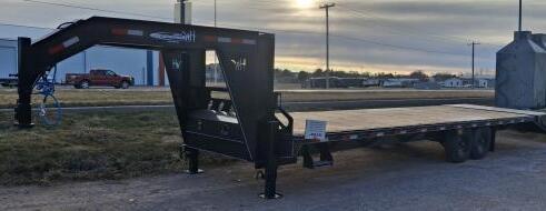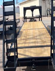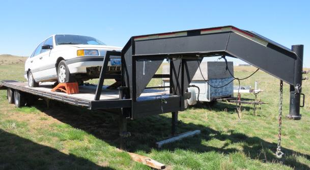 tandem axle Shop made bumper pull trailer; 2000 Texas Roll Back trailer 7’x20’ tandem axle bumper pull, metal deck; 5’x12’ single axle trailer; 6.5’x20’ tandem axle bumper pull trailer w/gas powered irrigation pump & fuel tank. HAY & FARM EQUIPMENT – ATTACHMENTS - BUILDING TRUSES