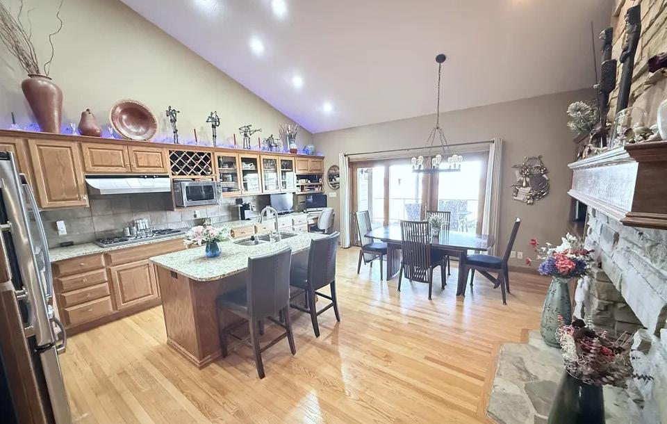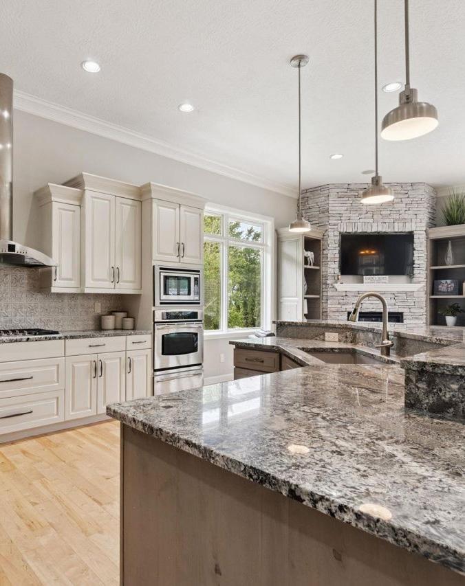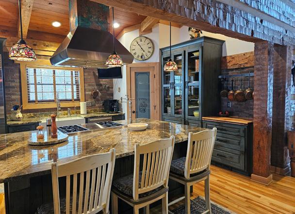 703 Timber Rd., North Sioux City, SD 4 bedroom | 4.5 bath | $1,650,000 New kitchen, custom cabinets. One of a kind, custom-built Stone Mill Oregon timber home on 1.16 acres adjacent to Dakota Dunes. 20’ vaulted ceiling, 5 fireplaces, primary suite on main, Hickory and tile floors, Rumsford fireplace with Chiefcliff stone, covered front porch.