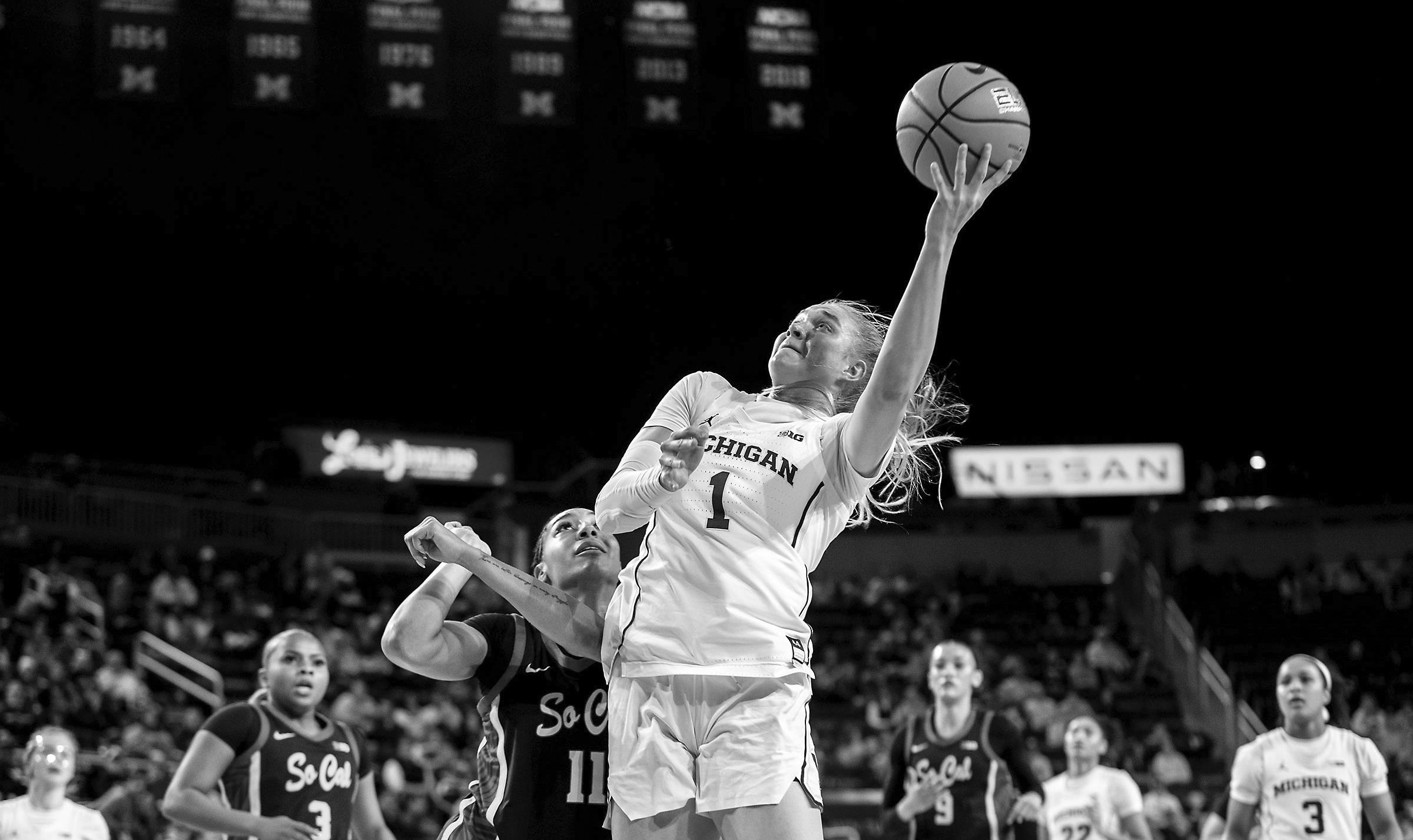 Three-level scoring highlighted the Wolverines’ early run, which opened with a post fade from sophomore guard Olivia Olson. Olson went straight back to work, connecting on her next three shots as Michigan dominated inside the paint. Sophomore guard Mila Holloway added to the scoring run with a 3-pointer and after a 15-5 start, Trojans coach Lindsay Gottlieb had little choice but to call a timeout.