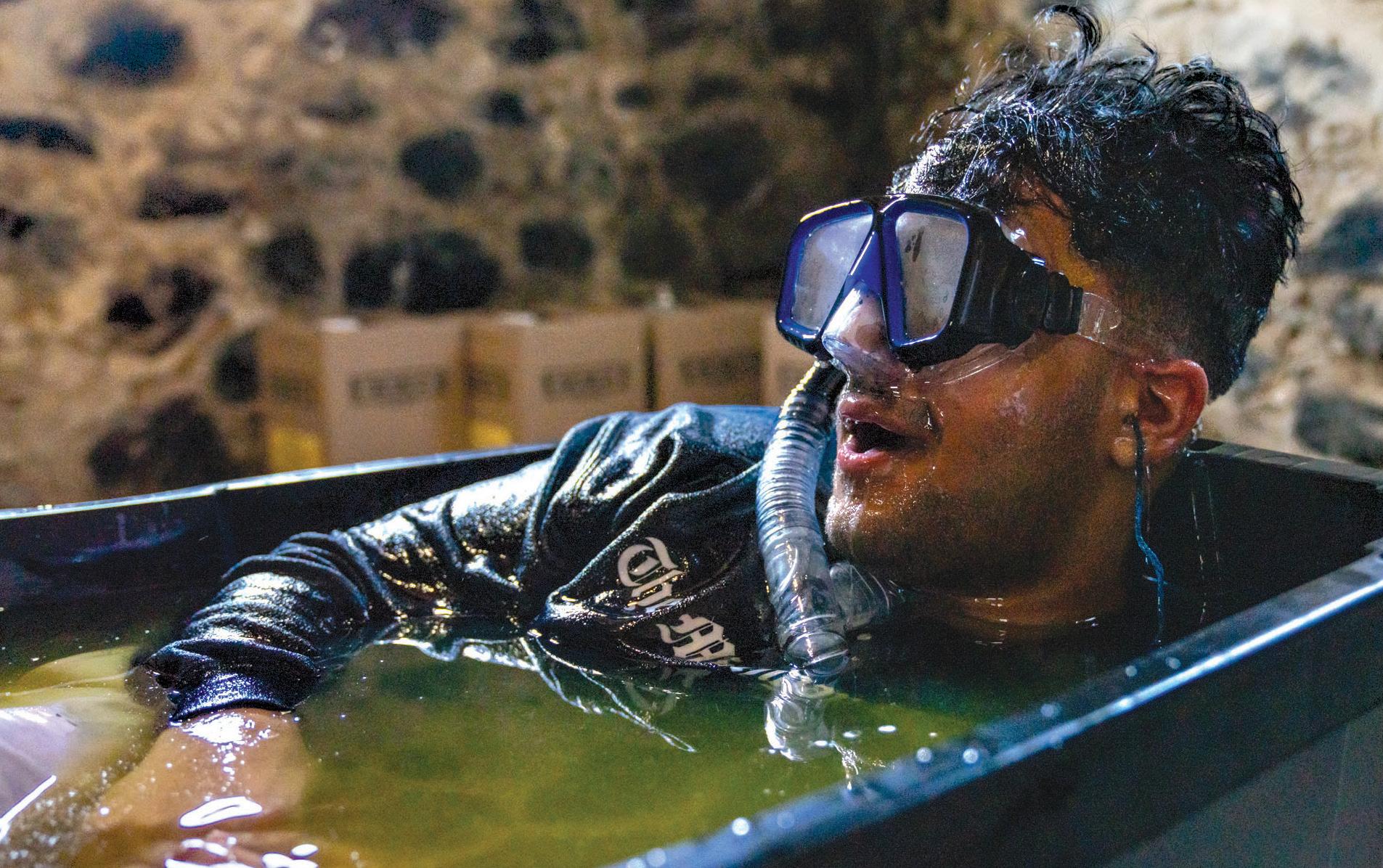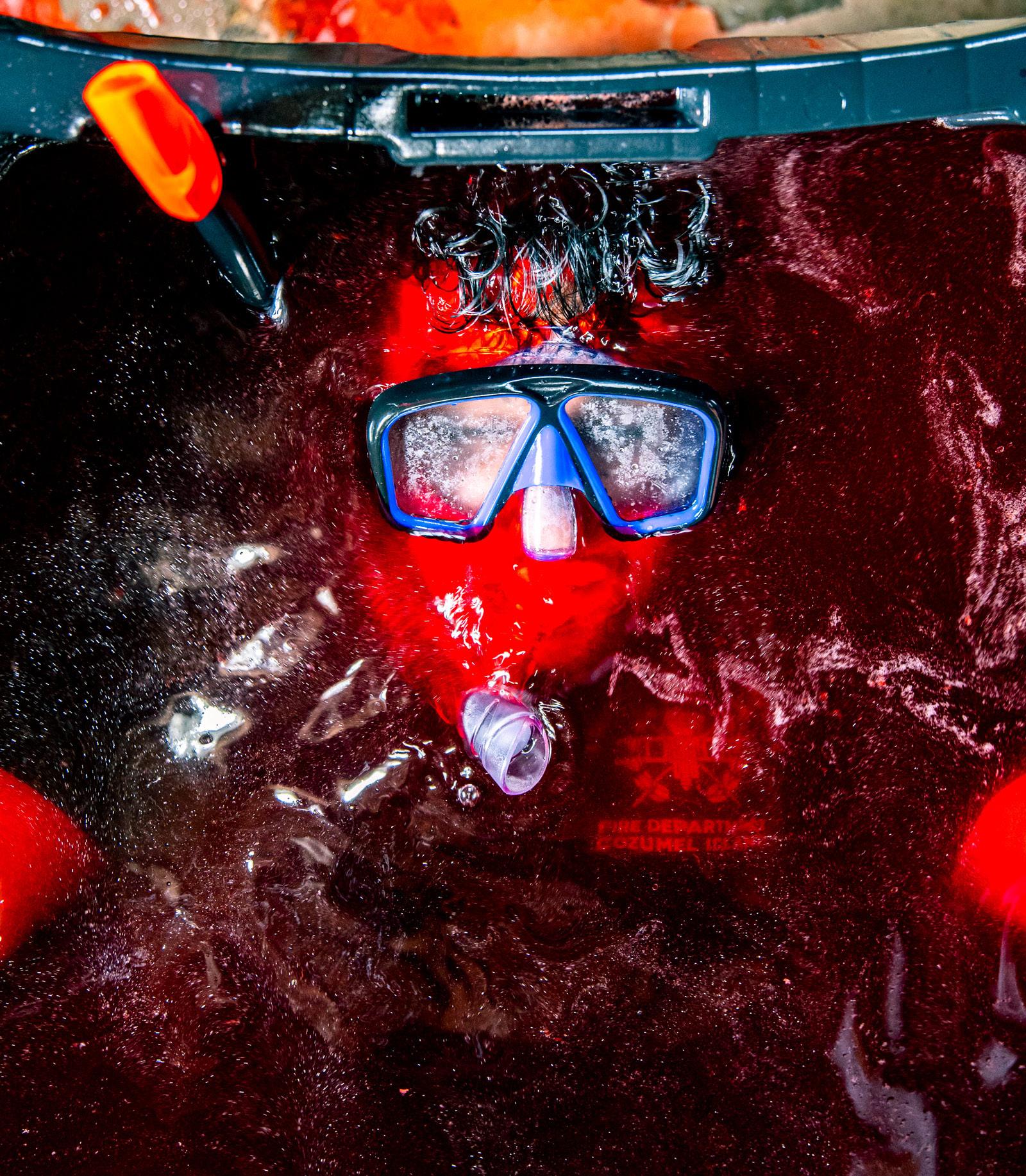 Though I had a scuba mask on to breathe while submerged, the air was almost burning with droplets of oil. All I could see was a yellow bog in front of me. Slowly, bits of oil began to leak into my scuba mask. My breaths became shorter and more hurried when, eventually, I was gurgling oil and had to get out. Five minutes — not as long as I had hoped to be in there, but enough time for me to get a good understanding of the medium I was in. I thought it would be best to keep that time the same for the other liquids, so I would be able to more accurately compare them.