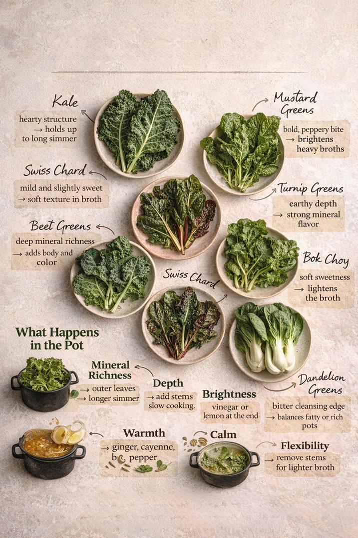 The greens you choose and how you cook them shape the character of the pot. Learning these differences turns instinct into knowledge.