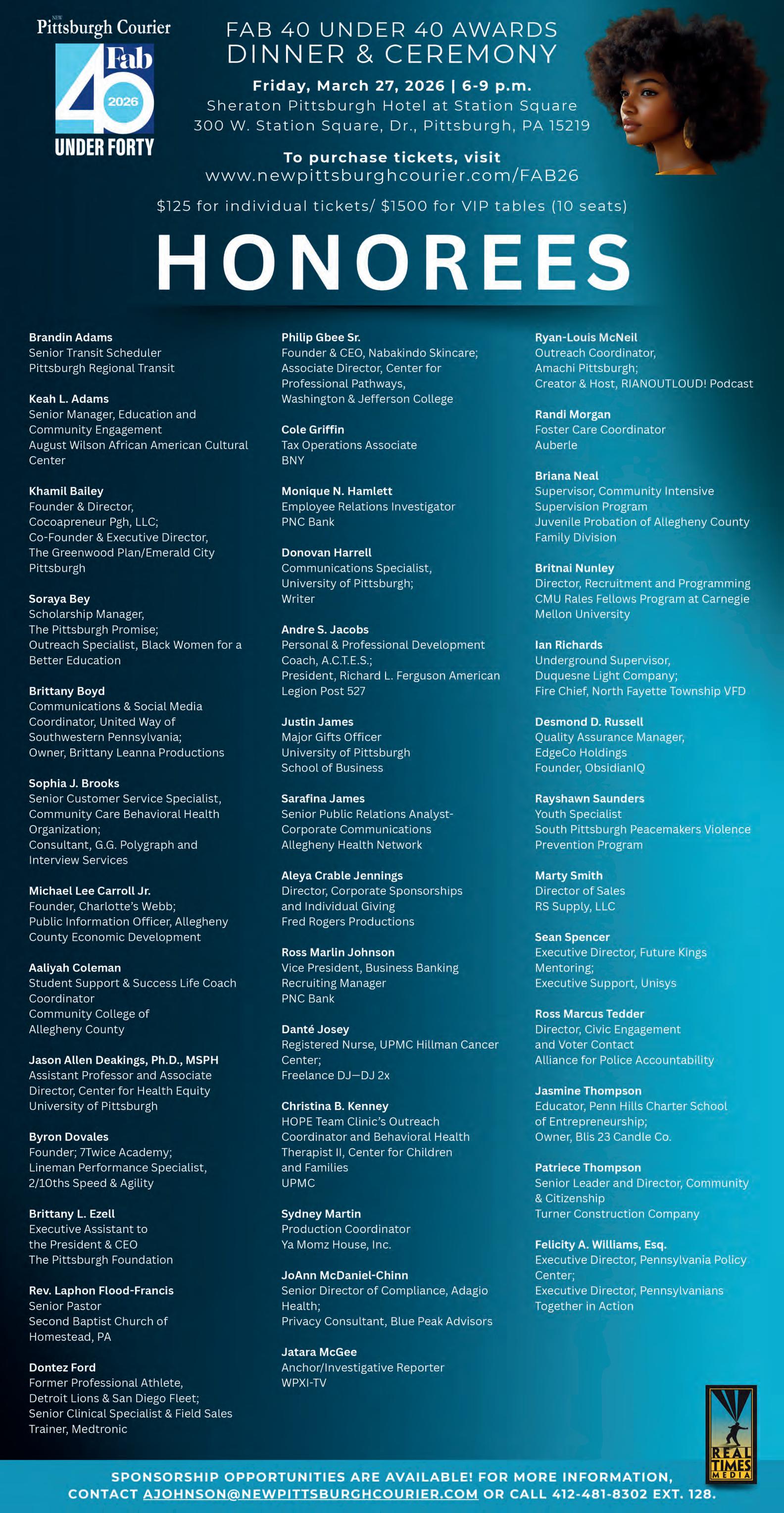 Nominated by Ashley Comans and Dr. Margaret Starkes, Erikka Grayson is a lifelong Hill District resident whose leadership spans education, youth development, and family advocacy. She serves as senior director of the Estelle S. Campbell Boys & Girls Club, overseeing programs that support hundreds of young people, and was recently elected Pittsburgh Public Schools board director for District 3. Her community-centered initiatives include founding Bomb Moms, a platform that uplifts and connects mothers, and leading culturally responsive literacy programs through the Margaret Washington Literacy & Inclusion Center.