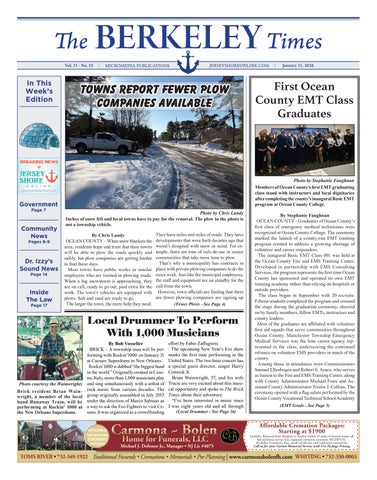By Chris Lundy TOMS RIVER - Remember last year, when beach replenishment efforts took place during the summer, closing portions of the beach at a time? That’s going to happen again. The State Department of Environmental Protection and the Army Corps of Engineering have given local towns a schedule for when the beach replenishment is going to take place. However, they warned it could change due to factors such as weather. According to the latest update, these are the projected times for the beaches to be replenished: • Bay Head: mid-June to early August. • Brick: mid-March to late June. • Lavallette: late August to late November. • Mantoloking: expected to be done soon. • Mantoloking northern area (Approximately 2000 feet north of Herbert Street to Bay Head): late June to late (Dune - See Page 5)
