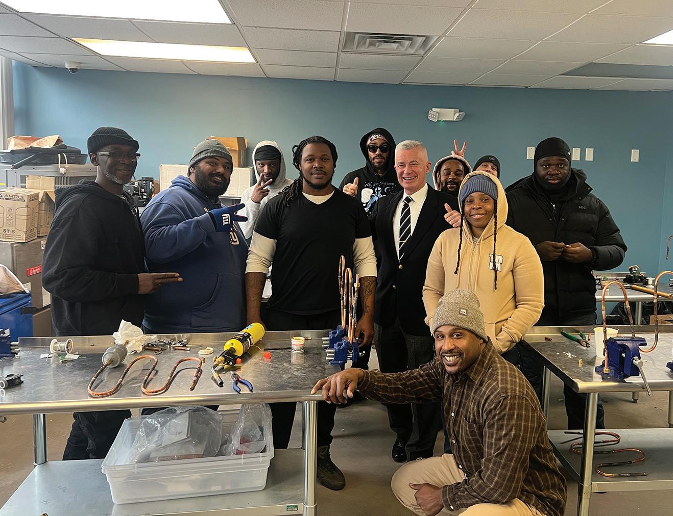 NJ Reentry Chairman former Governor Jim McGreevey (center) poses with NJ Reentry participants learning trades through hands on work.