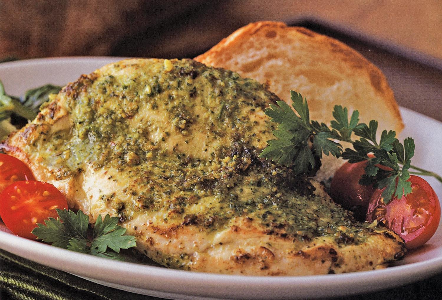 This classic pesto blend here is a lovely combination of toasted pine nuts, assertive basil leaves and Italian parsley that adds just the right flavor to the thin cutlets. (This pesto is also great on fish or swirled into hot pasta.)